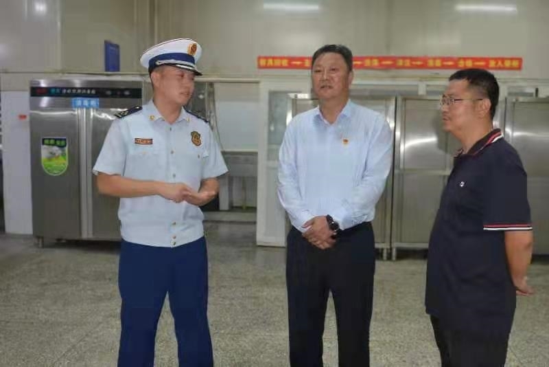 检查组一行首先到食堂大厅、灶间、面点间、洗消间进行安全检查。食堂内部窗明桌亮,地面一尘不染;食堂灭火器、消防带、灭火毯摆放整齐有序;食堂工作人员衣帽整洁,让检查组人员连声称赞。然后,检查组先后到教学楼、化学实验室、化学药品室、危险品柜检查消防安全工作。化学药品室药品摆放整齐,监控设备完好,危险品柜按照规定存放危险药品,消防沙箱和灭火器配备齐全,得到了蔡支队长和文局长的称赞。接着,检查组到学生宿舍进行消防安全检查。学生宿舍内物品摆放整齐有序,消火栓、灭火器、消防带配备完好,常闭防火门保持关闭状态,消防通道畅通无阻,宿舍内无任何违规电器,受到了蔡支队长及文局长的高度赞扬。