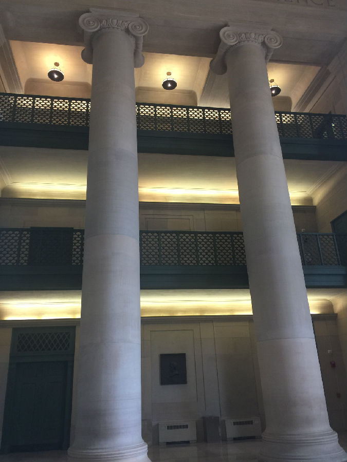 建成于1916年、由无尽长廊所贯穿、在麻省大道延绵几百米的1-10号楼群,是麻省理工学院现存最古老的建筑。这个楼群很好地延续了新英格兰地区主流的建筑风格——庄严,宏大,简洁,质朴,讲求古希腊和古罗马时期的对称之美。7号楼被当作MIT的正门,一进门就是休息大厅和接待中心。