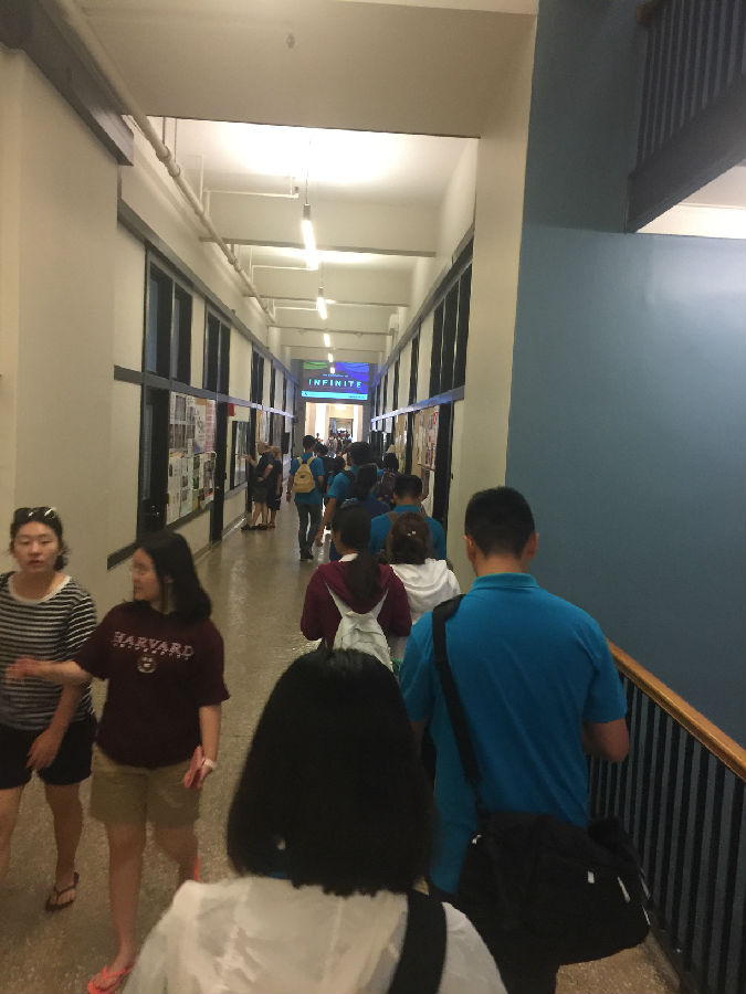 进入7号楼,充满传奇色彩的“Infinite Corridor”(无尽长廊)便展现在眼前,走廊贯通无数个教学楼,足足有252米长。在每年11月中旬和1月下旬的几天里,可以从长廊一端看到另一端的落日余晖,奇妙而辉煌,好多学生在这两个日子会守在走廊上观看奇景,为了形容这一奇特景象,还专门造了一个词“MIThenge”。麻省理工几乎所有的楼都以各种方式相连,其实哈佛也有相似的设计,而这样设计的目的,便是促进各学科各部门的交流,使得沟通不至于因为外界的雨雪阴晴和物理间隔所妨碍。