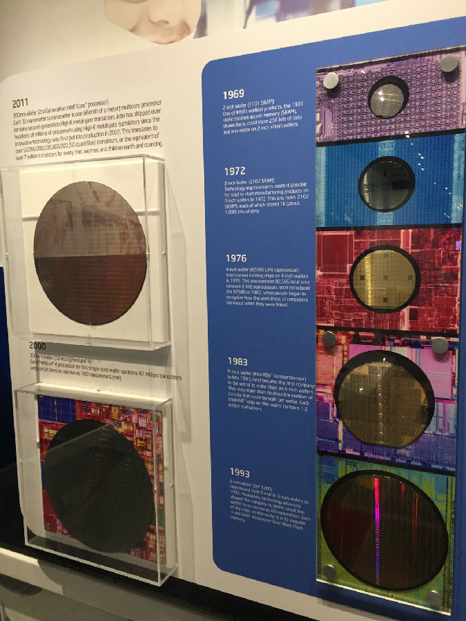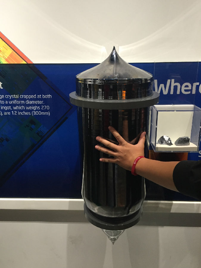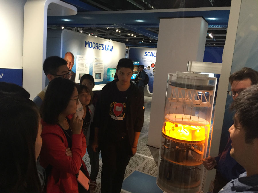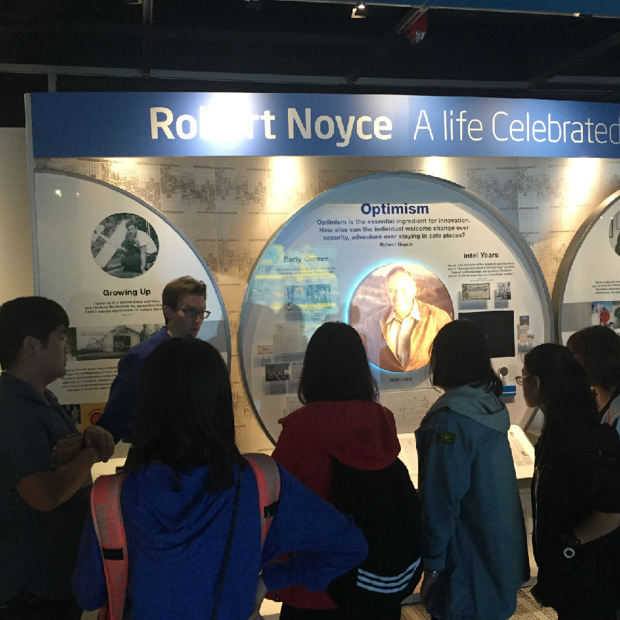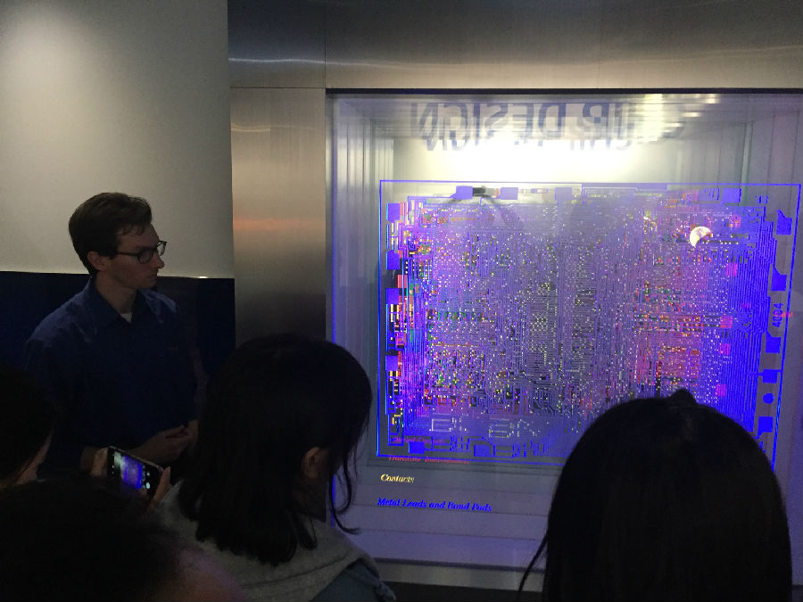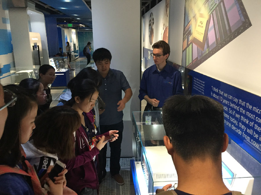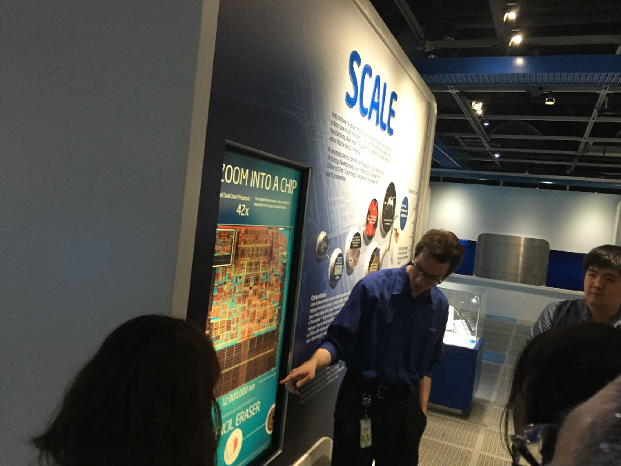 我们首站来到了英特尔公司,英特尔公司坐落在硅谷,总部正是位于美国加州,工程技术部和销售部以及6个芯片制造工厂则位于美国俄勒冈州波特兰。来到intel公司,仿佛进入了蓝色的海洋,从建筑到各种标识都体现出明快的蓝色。在这里有个陈列展即英特尔博物馆颇具特色,里面展示着因特尔的发展史以及出售一些纪念品。跟随一位因特尔工作人员进入展厅,进门先看到一张大幅黑白照片,是张常见的公司员工集体照,但不同的是这100人差不多全是富翁了。英特尔公司是全球最大的半导体芯片制造商,它成立于1968年,具有44年产品创新和市场领导的历史,照片是当时的100名员工,他们人人持有公司股票,据工作人员介绍说这里有1位上海人。1971年,英特尔推出了全球第一个微处理器,微处理器所带来的计算机和互联网革命,改变了整个世界。美国人也号称在近代有“四大发明”:电灯电话电影,然后就是因特尔公司发明了大规模集成电路。在展厅有一个电路实验:一块落地大玻璃,分别安放了许多材料,游人手持两个电极去接触,铜和铝是导体,能通电,玻璃和木材不导电,世界上大多材料是这两种,第三种是超导,第四种是硅这样的半导体。硅从沙子中提取,纯度要99.9。而电脑的芯片就是这种元素制作而成。英特尔公司是高科技设备及高素质的人才聚集地。