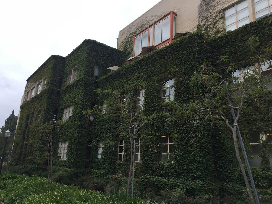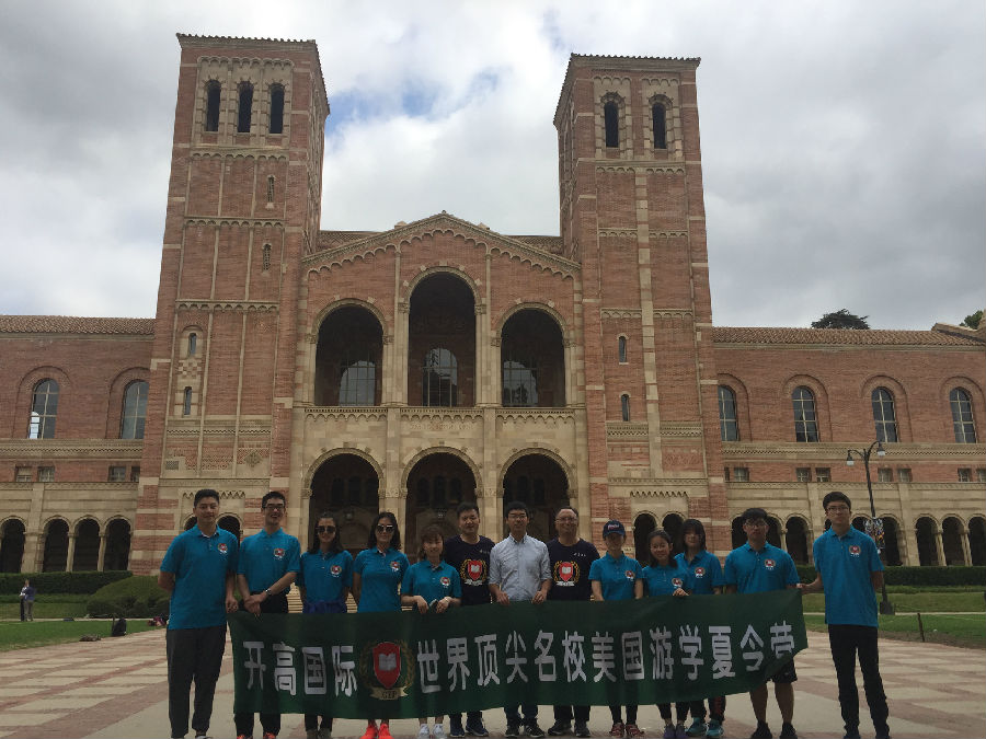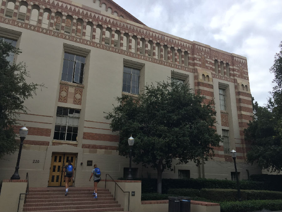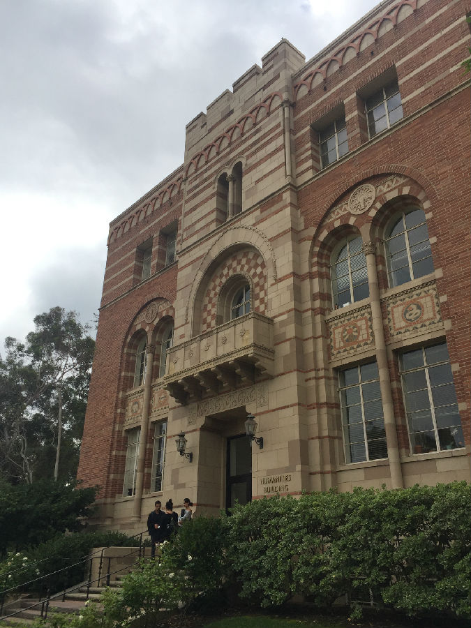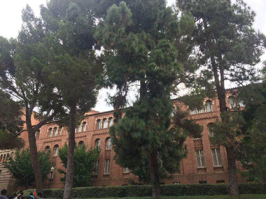 离开丹麦小镇,来到UCLA这所古老的公立学校,暑假期间正在这里做实验的开高13届校友胡昱已早早来到学校的标志前,等候大家的到来。胡昱本科毕业于复旦大学,直博研修的是核物理方向,这个暑期跟随UCLA的教授导师,同时也是国内的千人计划的大教授在UCLA核物理实验室日复一日地做研究和实验,一番寒暄后,胡昱带领大家进入UCLA,探访这所学校曾经的辉煌历史。据了解,加利福尼亚大学洛杉矶分校(University of California, Los Angeles,简称为UCLA)是位于美国加利福尼亚州洛杉矶市的一所公立研究型大学,是美国一流的综合大学。UCLA是美国商业金融、高科技产业、电影艺术等专业人才的摇篮,提供337个不同学科的学位,是全美培养尖端人才领域最广的大学之一。UCLA校园面积419英亩(约1.7平方公里),里面共有163个建筑,注册在校共约29000名本科生与13000名研究生。作为美国申请人数最多的大学,是全美高中生梦寐以求的名校之一。