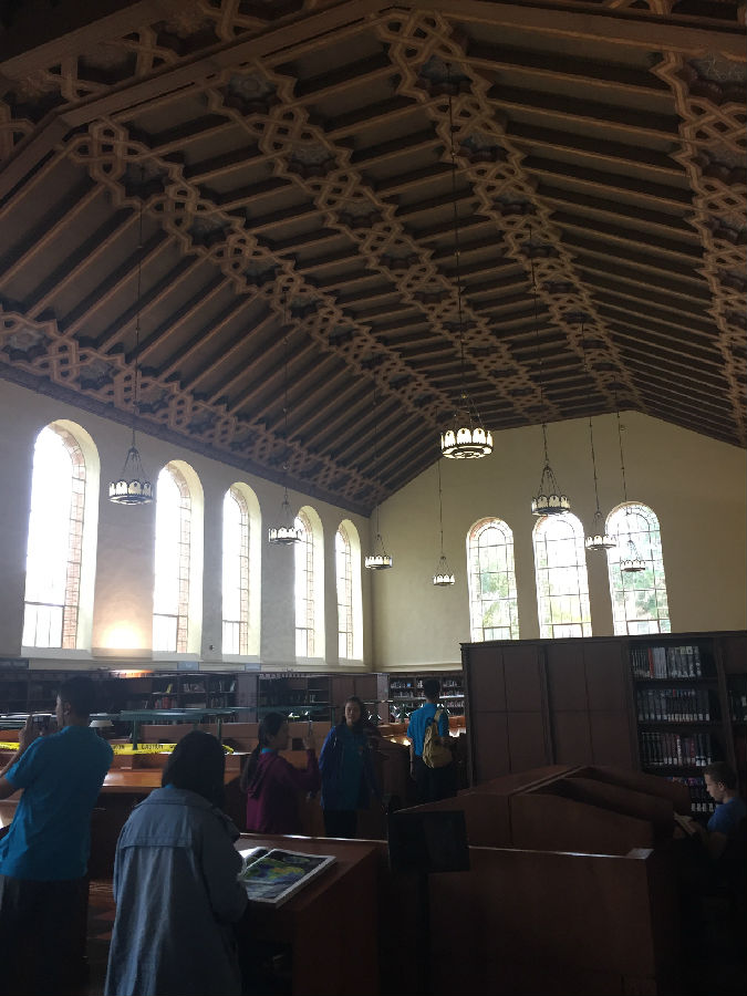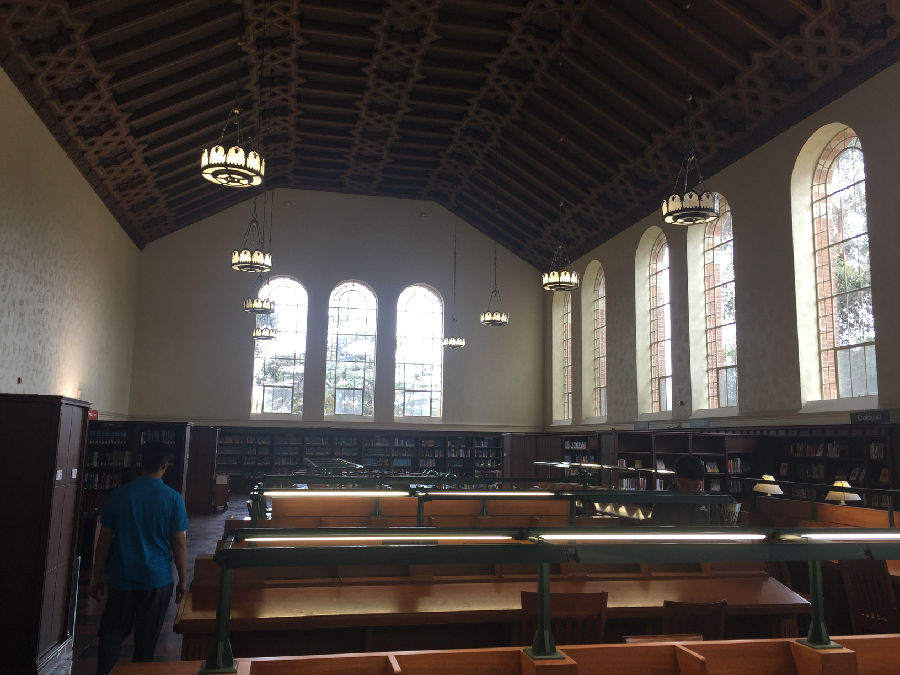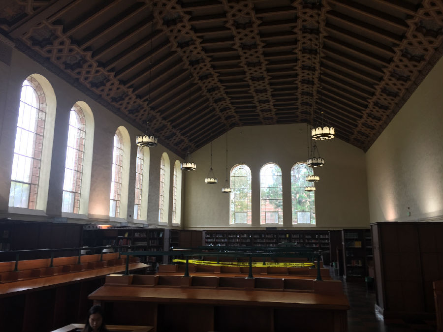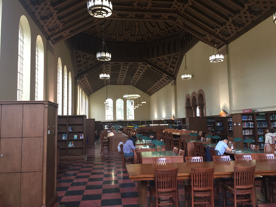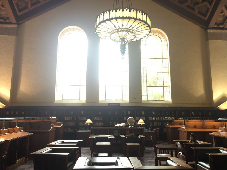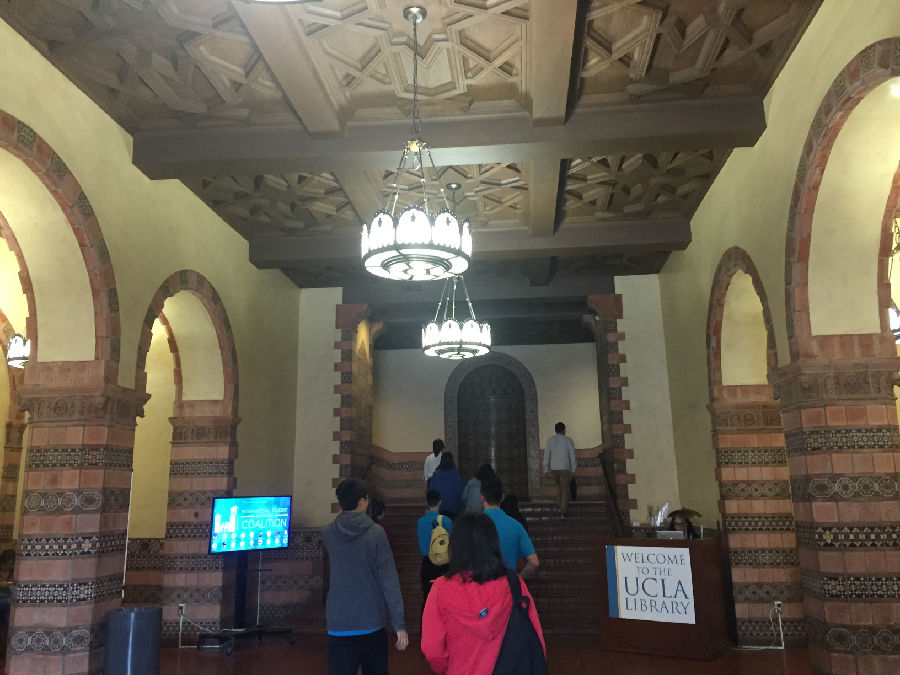 UCLA虽然身处洛杉矶,但与伯克利分校、纽约大学不同的是,UCLA跟城市的结合并不紧密,校园自成体系。校园里绿化很好,建筑由红砖砌成,看起来非常和谐漂亮。校园里安静平和,置身其中,你很难想象自己距离世界上最繁忙的都市仅仅几英里之隔。在UCLA研究生黄颖的带领下,我们来到UCLA古堡式的图书馆,所有人被眼前的一幕震撼了,就像哈利波特霍格沃兹学院一样,图书馆充满神秘和浓厚的学术气息,因为是暑期,所以馆内的学生并不很多,但是每位读书的同学并未因为我们的到来而停止读书,他们像是根本不知道外界发生了什么,埋头读书的认真劲让我们惊异。据学长说,UCLA 采用的是quarter system,这意味着,你一直在考试!!!本科大课教学,一堂课七八百人。和某些私立大学相比,UCLA 的 grade inflation (分数膨胀)没那么严重。在UCLA这样实在的大学,你得为你的成绩负责!不努力就没有A!因此每位同学在这里学习都非常拼命,学习到凌晨3-4点是常事,甚至通宵学习也不为过。UCLA的学生喜欢自称“ South Campus” people 和 “North Campus” people,住在South Campus的学生一般是工程类和自然科学类的学生,而North Campus 则是人文和商科类。South Campus 的日常:以计算机学院的学生为例,编程到凌晨3点,上午9点被闹钟吵醒,花了5秒钟决定不去上课了(因为是选修),然后继续睡,下午1点穿着篮球T恤短裤滚去实验室继续编程。。。North Campus 的日常:每天把头发梳的锃明瓦亮,衣着光鲜漂亮的去上课。笔记漂亮的能出书了,社交生活丰富,平均每周参加3场招聘。艺术系的学生的日常:电影专业的学生天天都呆在剧院里,音乐专业的学生24h*7d都在练琴,而且只跟同专业的学生出去玩儿。