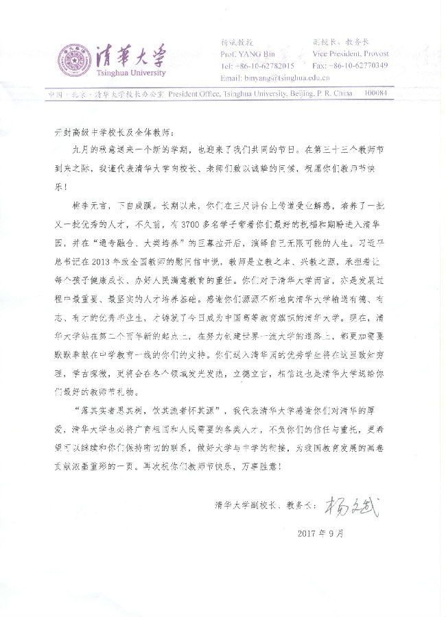 值第33个教师节来临之际,清华大学给我校寄来贺信,向全体教师致以节日的问候。