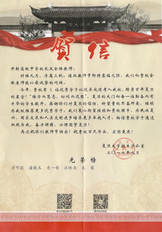 值教师节来临之际,复旦大学给我校发来贺信,向全体教师致以节日问候。