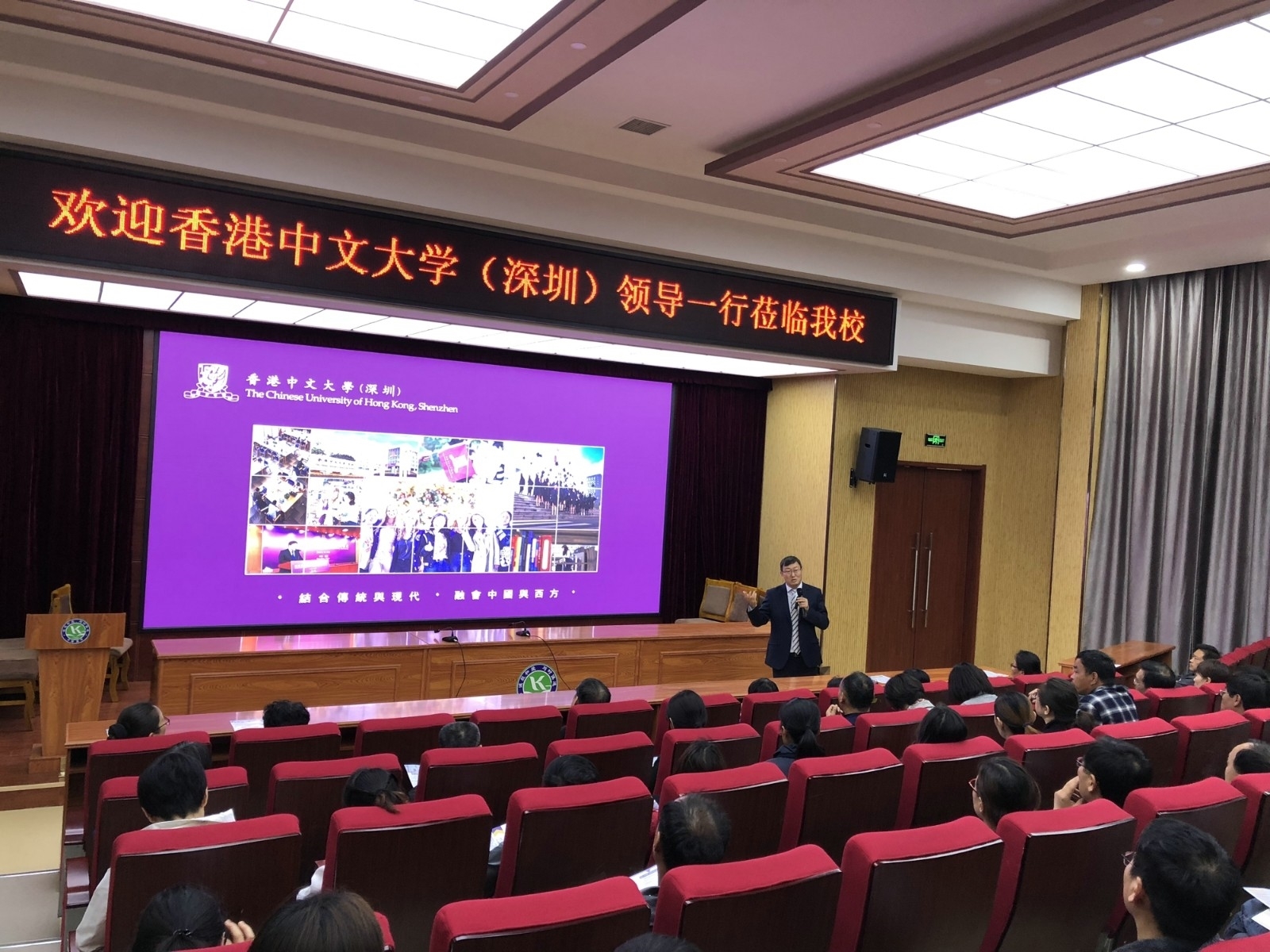 4月18日晚上,香港中文大学(深圳)就业服务中心处长、招生处长张韶峰教授、香港中文大学(深圳)河南招生组张若含老师一行二人莅临开封高中,我校副校长马分产、招生与国际交流处主任苗森进行了热情地接待。
