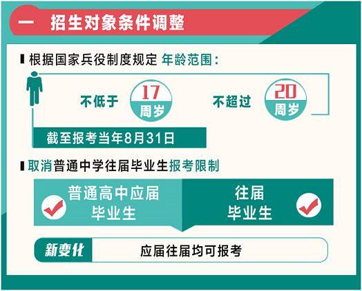从今年起,根据国家兵役制度规定,报考军事院校和国防生的考生最低报考年龄均不得低于17周岁、不超过20周岁(截至报考当年8月31日);取消普通高中往届毕业生报考限制,符合条件的普通高中应届、往届毕业生均可报考。