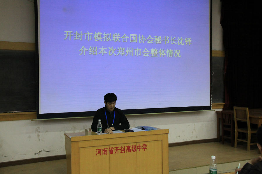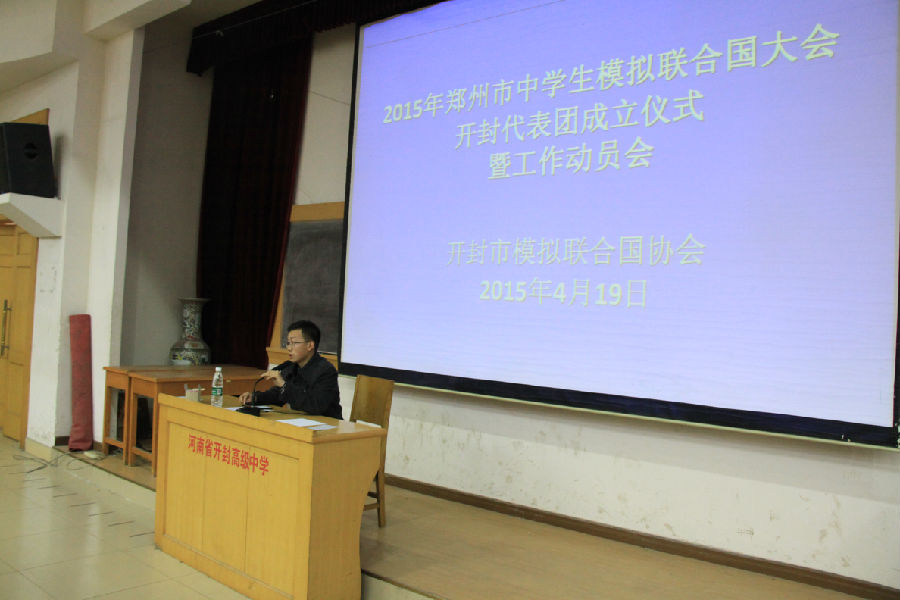 2015年4月19号下午三点整,在开封高中东报告厅举行了2015年郑州市中学生模拟联合国大会开封代表团成立仪式暨工作动员会。参会的领导及老师有:开封市团市委学校部部长孙楠女士、开封高中团委副书记苗森老师、开封高中模联东校区负责人岳永辉老师以及西校区负责人王文昊老师。