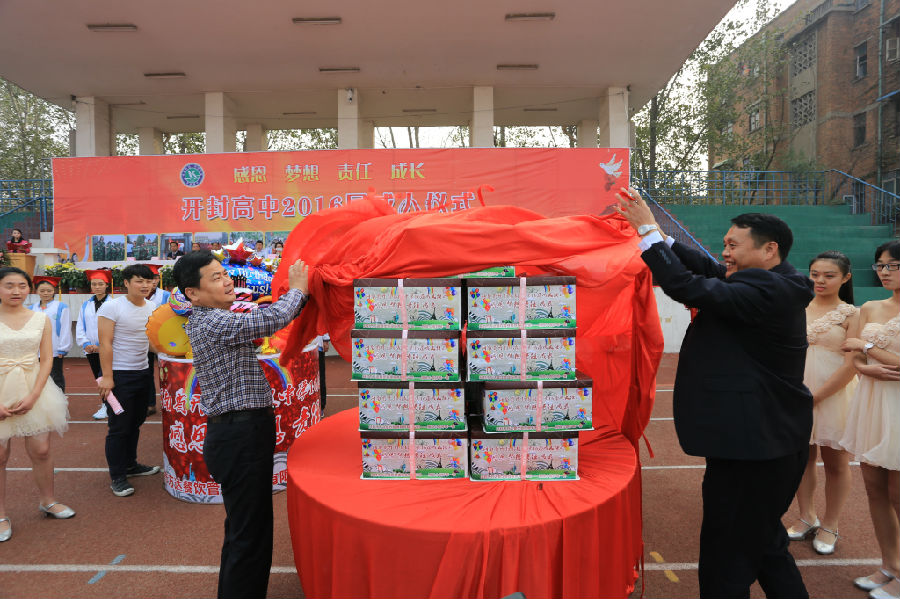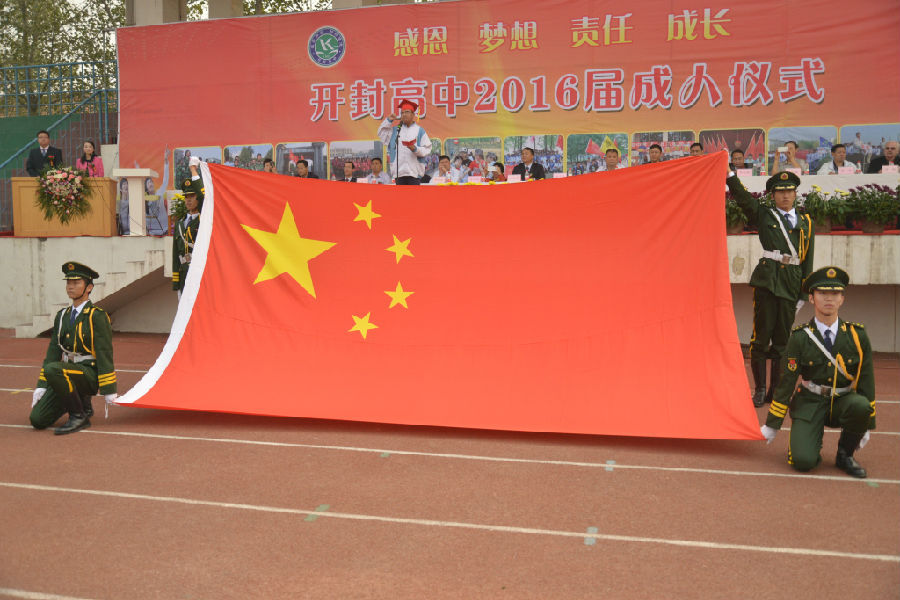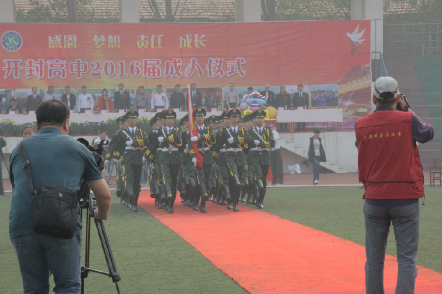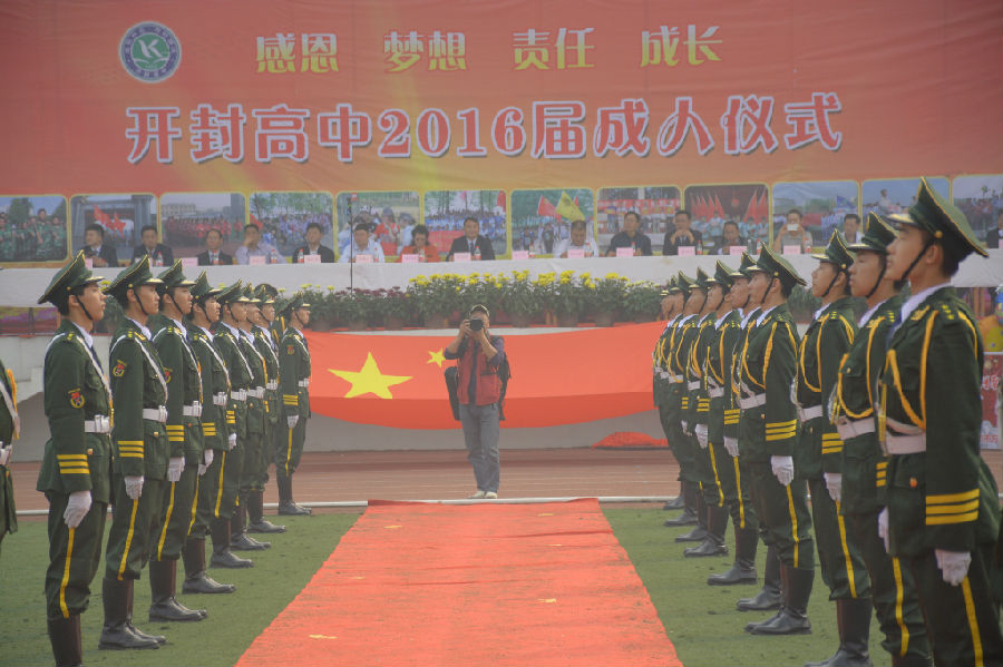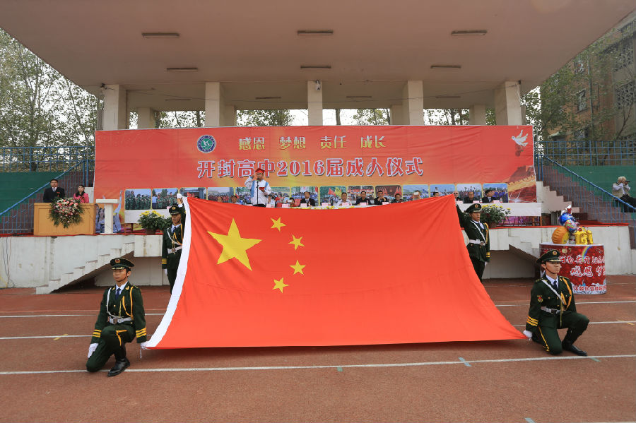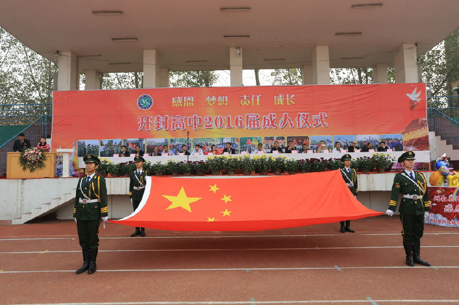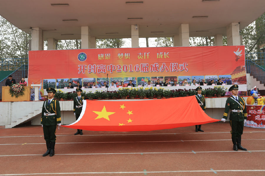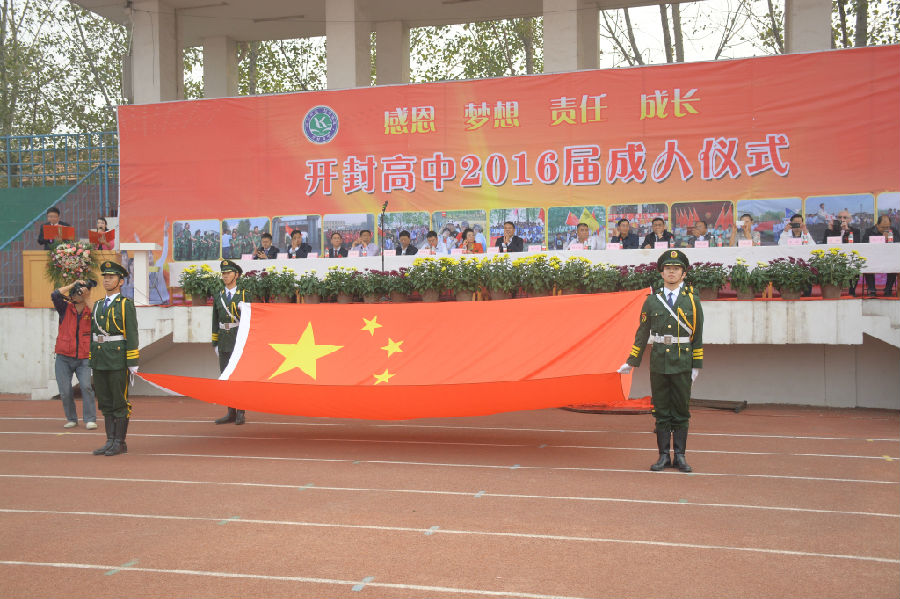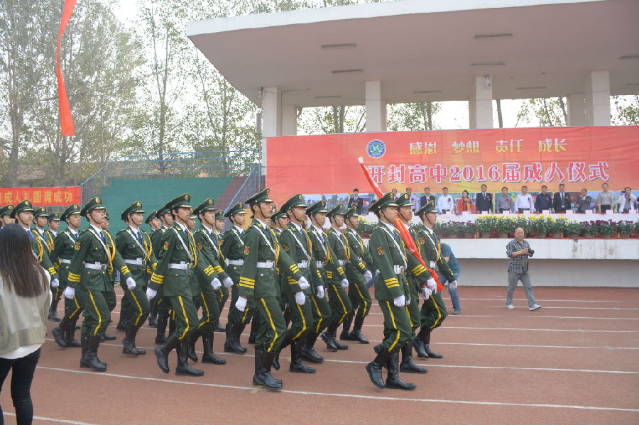 仪式从《天之大》和《父亲》两首动人的演唱开始,开封高中的国旗护卫队的同学英姿挺拔、步履铿锵,在升旗仪式环节表现尤为突出,将大校风范展现的一览无遗!台上就座的相关领导们一起为来自18个班级的学生代表冠盖成人礼帽,李局长和耿校长共同揭幕了大蛋糕,将把带着满满祝福的蛋糕分发到每个班级学生代表的手中。紧接着每个学生与自己的家长进行了互换一封信来交流彼此心声,每个家长都情不自禁地拥抱了孩子,并为之冠盖成人礼帽,然后各班老师为学生正衣冠、正流苏、握手,学生向老师拜谢行礼;由刘泽全等四名同学真情朗诵的《启程》令在场人员无不为之动容;之后,学生在氢气球上写上自己的理想大学、青春梦想,伴随着18声礼炮,在主持人的号令下一同放飞,当漫天飞舞的气球飞向蓝天时,整个操场瞬间沸腾了,欢呼声响彻云霄,这一幕将成人仪式活动推向高潮。最后,同学们面对国旗庄严宣誓后,一起走过“成人门”,当学生们依次通过成人门时,站在另一端等候的家长们看着此情此景,眼中含着热泪,有的满是复杂留恋的表情,有的脸上绽放着欣慰幸福的笑容,纷纷上前迎接并合影留念。集体照留念后,同学们在各自班中集体庆生,此次活动在每一位同学心中留下永生难忘的印记。
