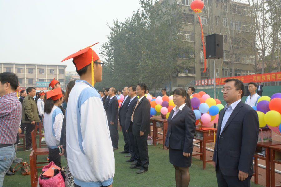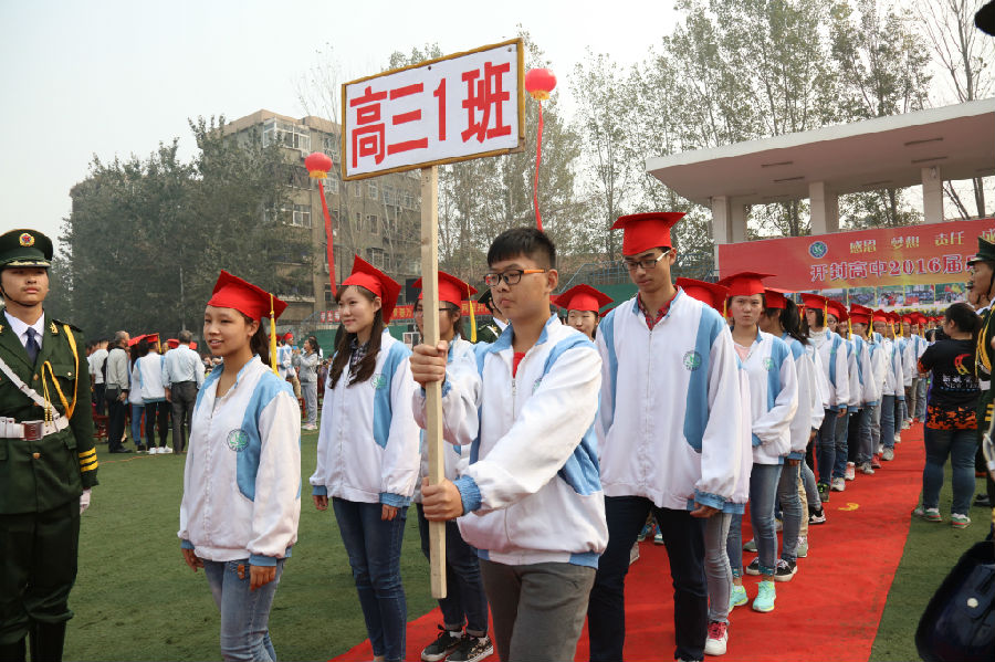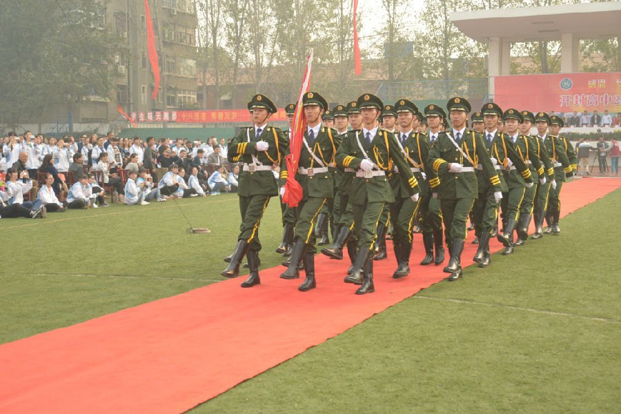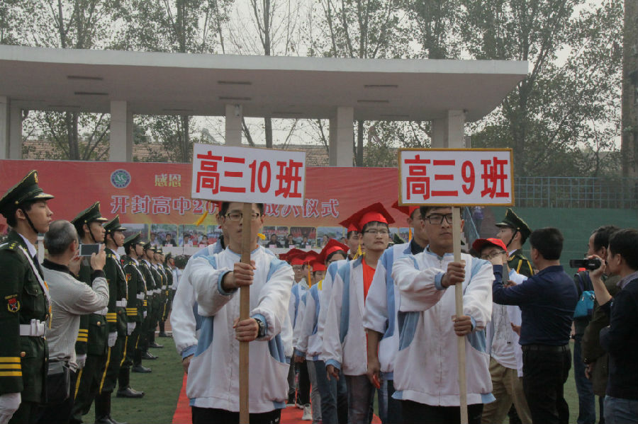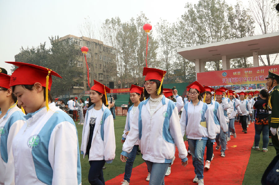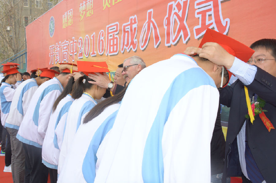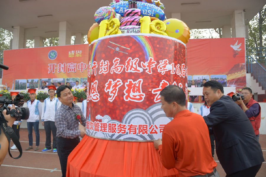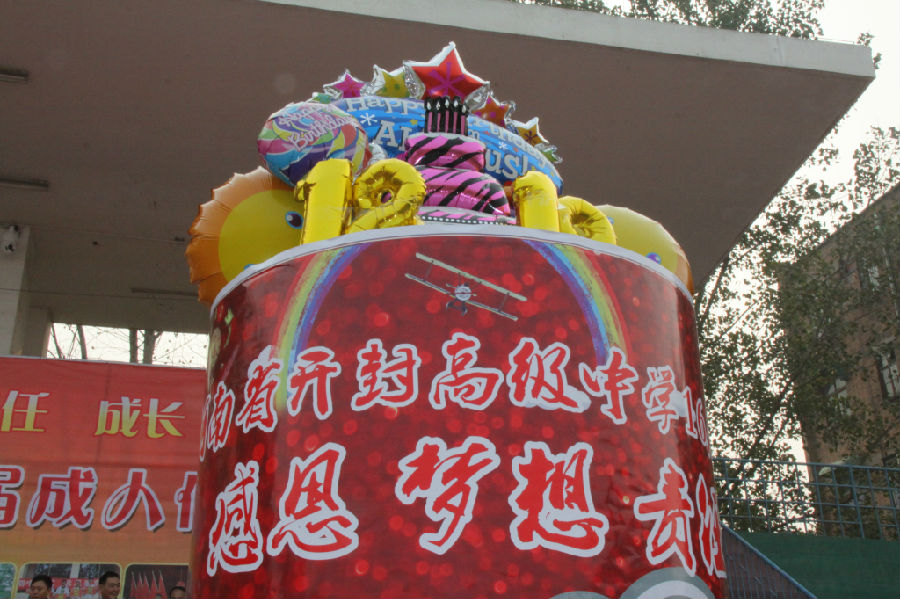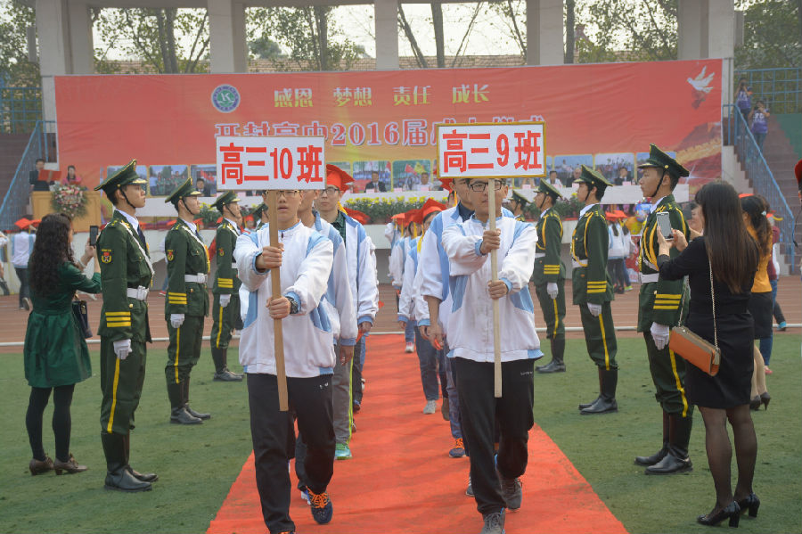 仪式从《天之大》和《父亲》两首动人的演唱开始,开封高中的国旗护卫队的同学英姿挺拔、步履铿锵,在升旗仪式环节表现尤为突出,将大校风范展现的一览无遗!台上就座的相关领导们一起为来自18个班级的学生代表冠盖成人礼帽,李局长和耿校长共同揭幕了大蛋糕,将把带着满满祝福的蛋糕分发到每个班级学生代表的手中。紧接着每个学生与自己的家长进行了互换一封信来交流彼此心声,每个家长都情不自禁地拥抱了孩子,并为之冠盖成人礼帽,然后各班老师为学生正衣冠、正流苏、握手,学生向老师拜谢行礼;由刘泽全等四名同学真情朗诵的《启程》令在场人员无不为之动容;之后,学生在氢气球上写上自己的理想大学、青春梦想,伴随着18声礼炮,在主持人的号令下一同放飞,当漫天飞舞的气球飞向蓝天时,整个操场瞬间沸腾了,欢呼声响彻云霄,这一幕将成人仪式活动推向高潮。最后,同学们面对国旗庄严宣誓后,一起走过“成人门”,当学生们依次通过成人门时,站在另一端等候的家长们看着此情此景,眼中含着热泪,有的满是复杂留恋的表情,有的脸上绽放着欣慰幸福的笑容,纷纷上前迎接并合影留念。集体照留念后,同学们在各自班中集体庆生,此次活动在每一位同学心中留下永生难忘的印记。