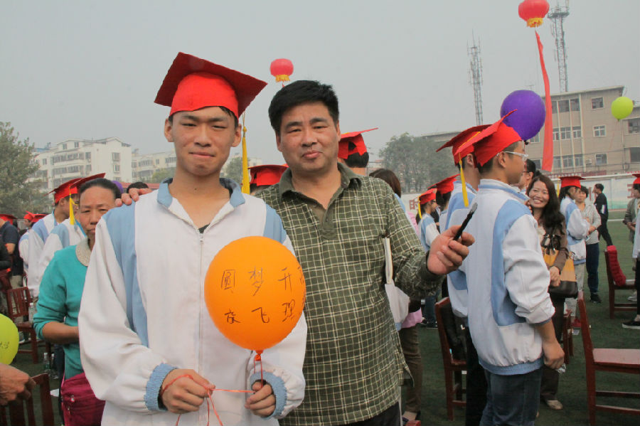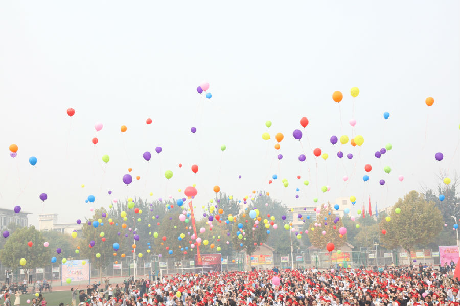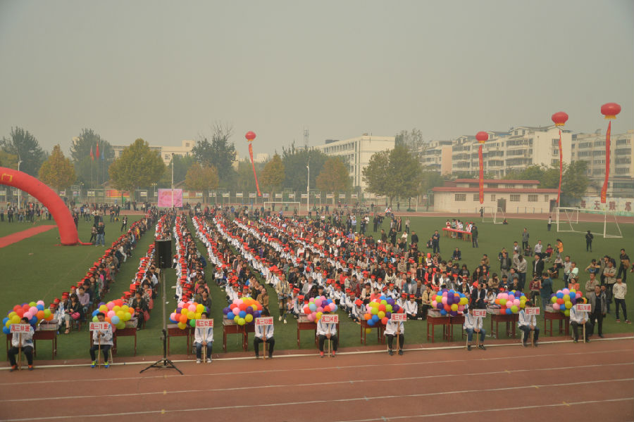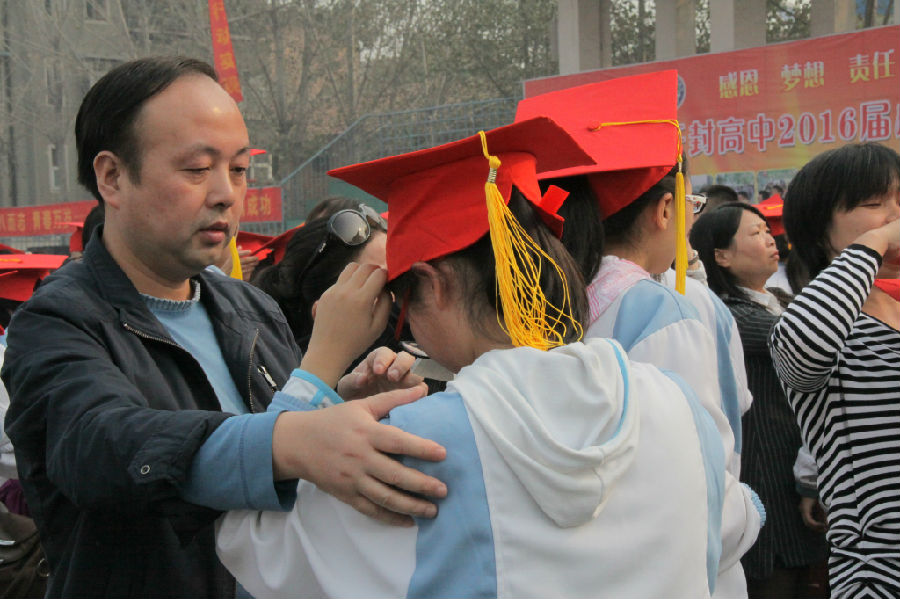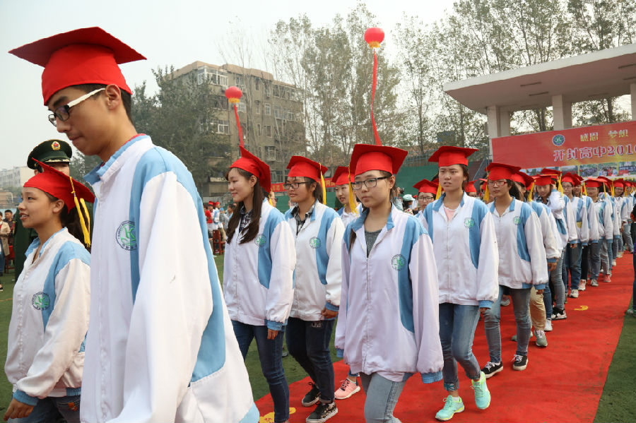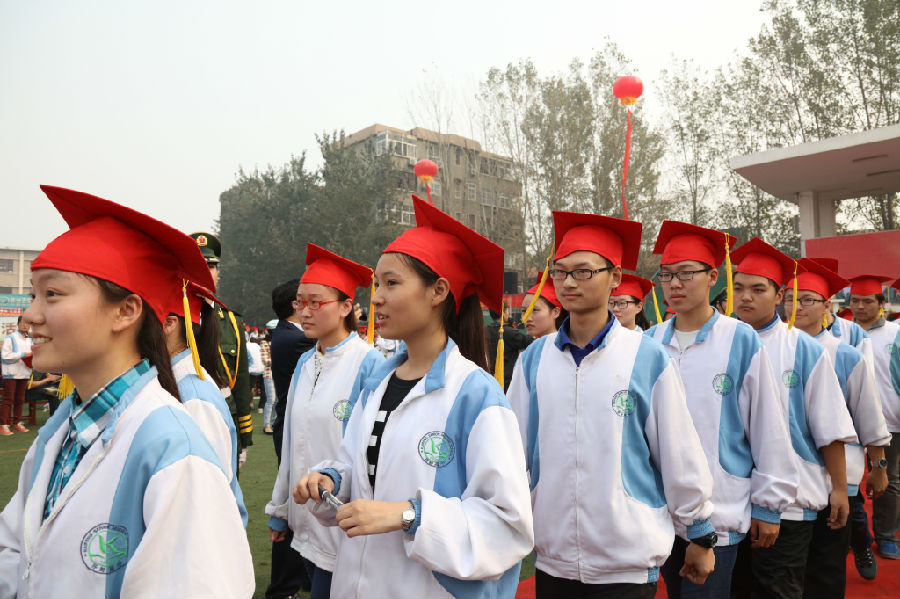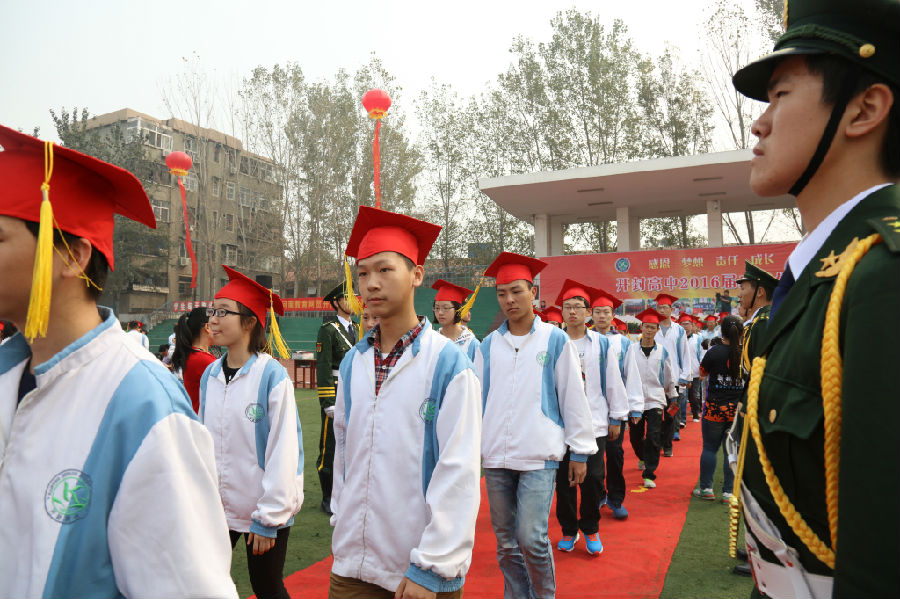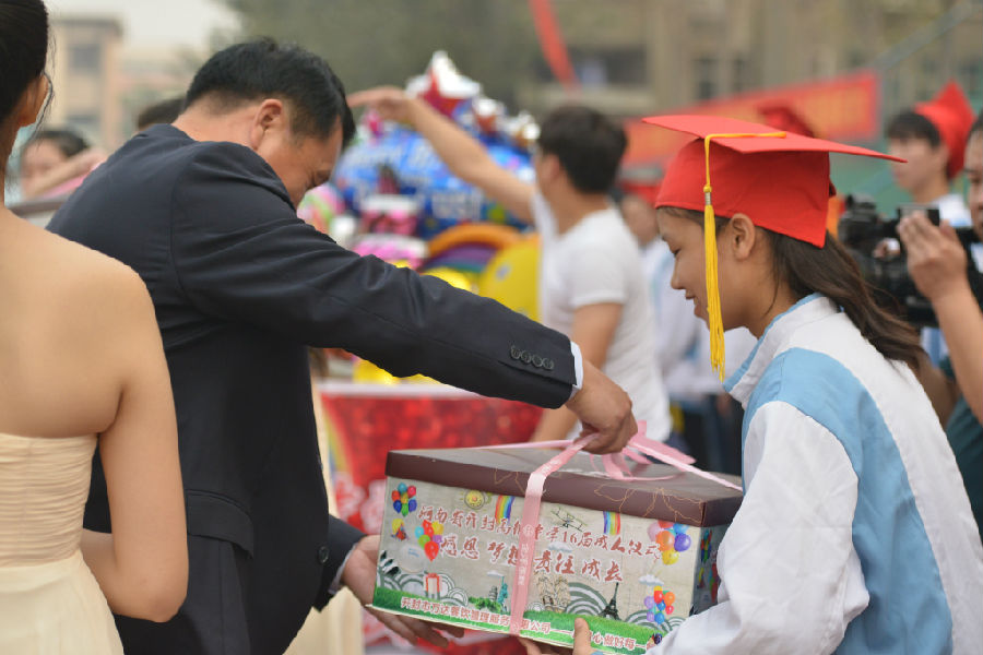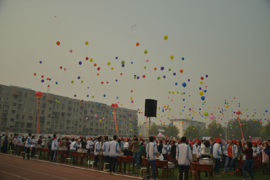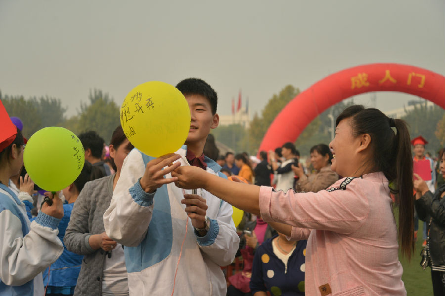 仪式从《天之大》和《父亲》两首动人的演唱开始,开封高中的国旗护卫队的同学英姿挺拔、步履铿锵,在升旗仪式环节表现尤为突出,将大校风范展现的一览无遗!台上就座的相关领导们一起为来自18个班级的学生代表冠盖成人礼帽,李局长和耿校长共同揭幕了大蛋糕,将把带着满满祝福的蛋糕分发到每个班级学生代表的手中。紧接着每个学生与自己的家长进行了互换一封信来交流彼此心声,每个家长都情不自禁地拥抱了孩子,并为之冠盖成人礼帽,然后各班老师为学生正衣冠、正流苏、握手,学生向老师拜谢行礼;由刘泽全等四名同学真情朗诵的《启程》令在场人员无不为之动容;之后,学生在氢气球上写上自己的理想大学、青春梦想,伴随着18声礼炮,在主持人的号令下一同放飞,当漫天飞舞的气球飞向蓝天时,整个操场瞬间沸腾了,欢呼声响彻云霄,这一幕将成人仪式活动推向高潮。最后,同学们面对国旗庄严宣誓后,一起走过“成人门”,当学生们依次通过成人门时,站在另一端等候的家长们看着此情此景,眼中含着热泪,有的满是复杂留恋的表情,有的脸上绽放着欣慰幸福的笑容,纷纷上前迎接并合影留念。集体照留念后,同学们在各自班中集体庆生,此次活动在每一位同学心中留下永生难忘的印记。