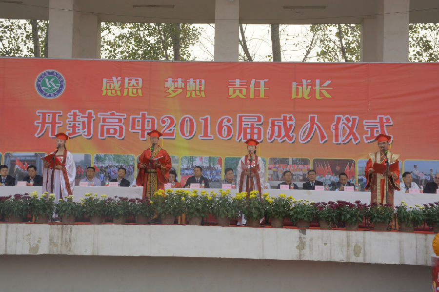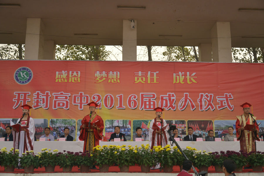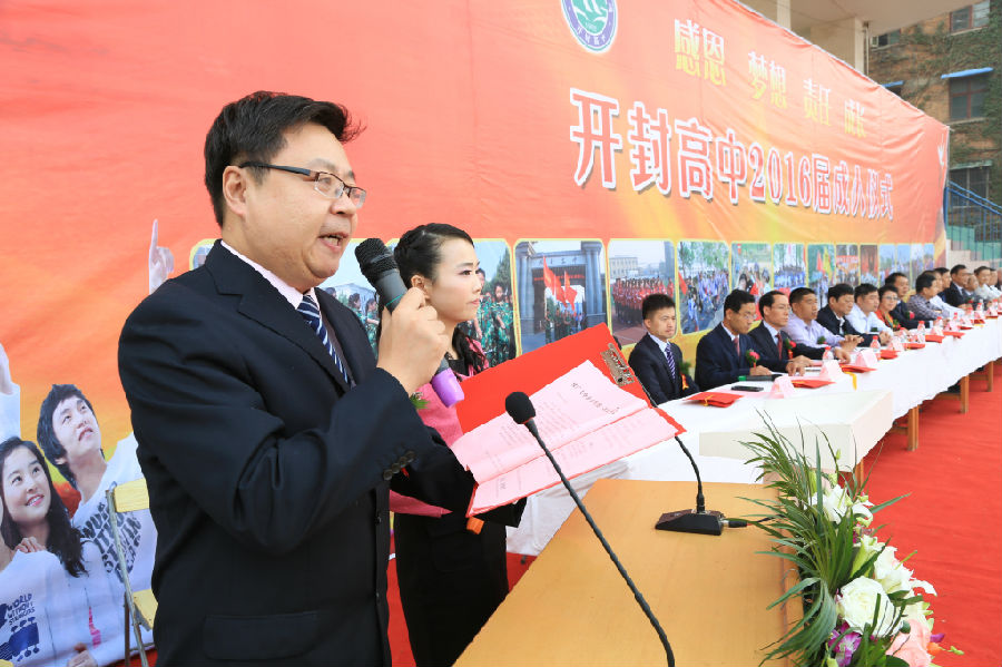 为了打造开封高中精品活动,开封高中各处室教师付出了艰辛的努力和劳动。从现场场地布局到仪式各个环节的设计、安排,可谓环环相扣、打动人心。受校长耿振勇的委托,由副校长马分产代表学校领导做了热情洋溢的发言讲话,在发言中指出成人仪式的意义“成人仪式是我国一种特殊的社会教育,是在青少年年满18岁时举行的象征迈向成人阶段的仪式。18岁是一个人从未成年向成年转变,身心发生质变,世界观、人生观、价值观初步形成的关键时期。通过开展18岁成人仪式教育活动,不仅能够引导学生明确成人的意义与所肩负的责任,在高三之初确立自己的理想目标,坚持不懈为之奋斗,而且能教育和引导他们把热爱祖国、尊师感恩与服务建设家乡结合起来,使我校青少年在学习中进步,在实践中成长,不断创造新的人生佳绩。”