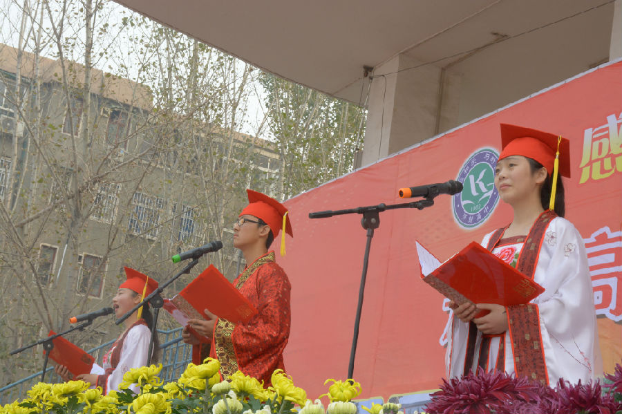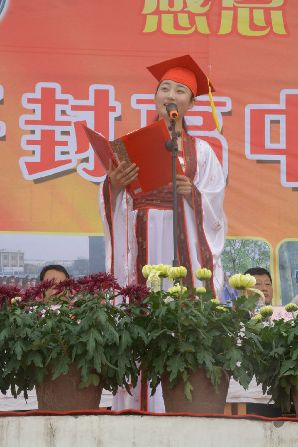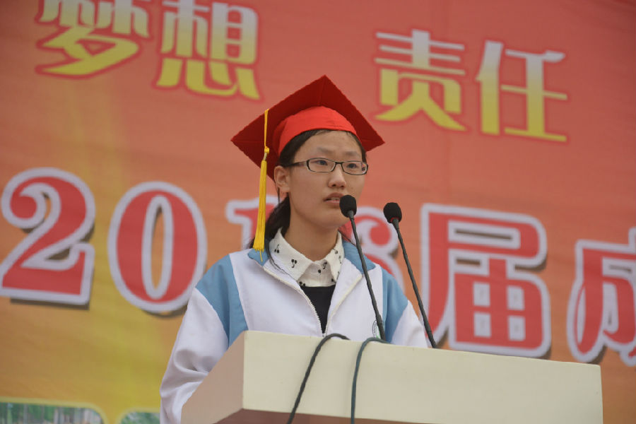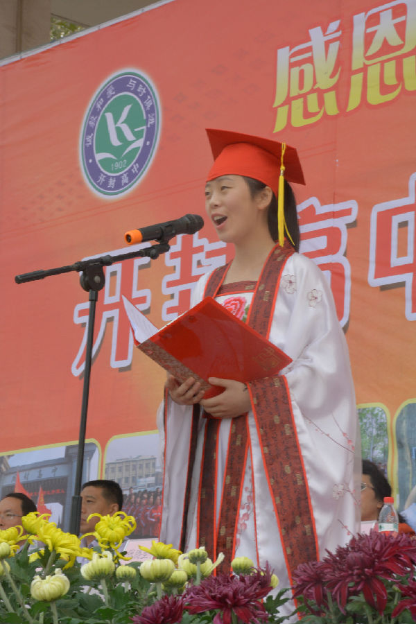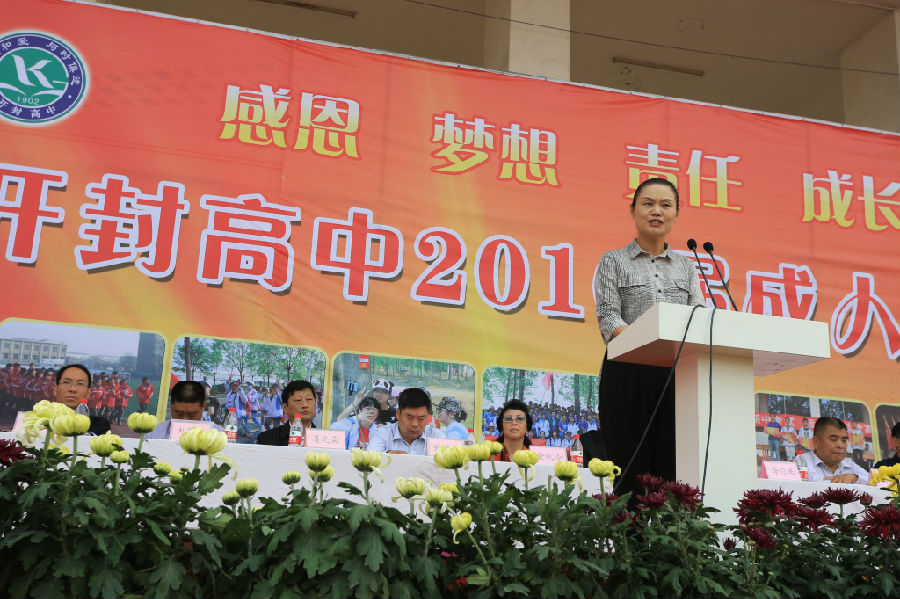 “十八岁的你们已经成人,应怀着一颗感恩的心回报家庭、社会和辛勤培养你们的老师,做一个坚强的孩子,遇到困难不低头,不后退,克服困难,勇往直前!”学生家长代表1617班陈鑫潼的妈妈刘宏媛女士向孩子们表达了在场所有父母的心声。 “站在今天的成人礼上,让我们完成自己最华丽的蜕变,从此我们将是每个家庭最年轻的力量,开封高中最具战斗力的展示,中华人民共和国最骄傲的希望!”这是学生代表1614班张帆同学向全体同学发出的倡议。“从开封高中走出的学生,你理所应当要与众不同:你应该播种善良,让自己的心不被世俗玷污;你应该学会承受,让自己能禁得住成败,也能坦然面对得失……”这是教师代表1613班班主任张传涛在发言中向学生们寄予的无限期望。