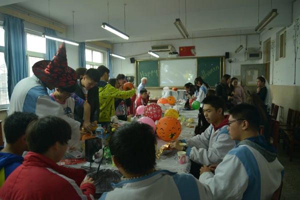 为了丰富外教的业余生活,尊重外籍教师的习俗,同时也为了增长国际班学生的知识,增进师生间的感情,10月30日下午,在校的外籍教师道格拉斯、胡安,国际班班主任以及部分任课教师和全体国际班学生欢聚一堂,共同度过了一个愉快的万圣节。