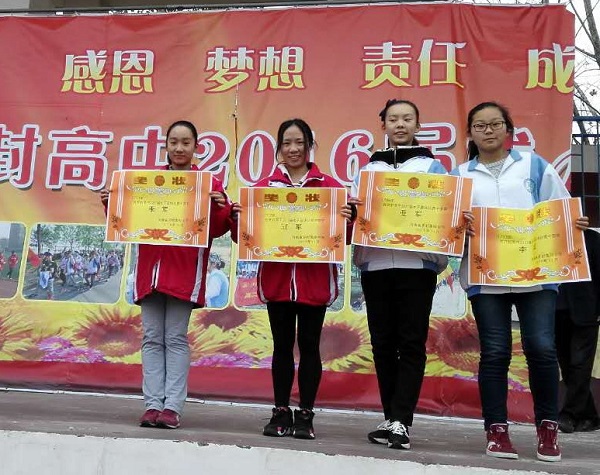 在体育组2017届备课组老师和2017届年级段的共同努力下顺利完成本次比赛工作于11月10日在全校课间跑步时举行了颁奖仪式,由2017届年级段主任娄渊中主任及年级副主任赵向东主任、王洪杰主任为本次比赛获得冠军、亚军、季军的班级进行颁奖。