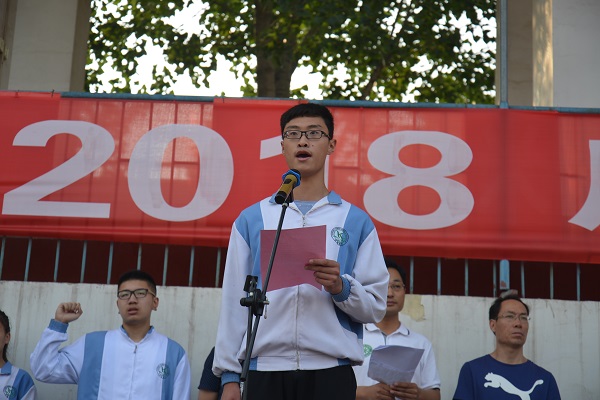 张辰贝主任的精彩发言赢得台下家长与学生的阵阵掌声,随后,1810班李子博同学带领开封高中2018届全体同学,在飘扬的国旗下,在校旗下,在年级旗下,在父母面前,庄严宣下高三誓言。