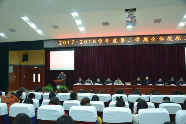 党委书记、校长作了题为《不忘初心,牢记使命,上下同心,奋力作为,促进教育教学质量再上新台阶》的工作报告,报告对寒假工作做了简要总结,对新学期工作重点进行了部署。报告指出:新学期工作指导思想是全面贯彻党的十九大精神,以习近平新时代中国特色社会主义思想为指导,贯彻党的教育方针,落实立德树人根本任务,办好人民满意的学校,秉承“为学生的终身幸福奠基,为社会的整体进步育人”的办学宗旨,坚持“四实、四真、四早”的工作理念,以“做精东校,办强西校,打造全国一流名校”为目标,以“内涵发展,质量强校”为主题,以提高教学质量为核心,以精细化管理为抓手,突出重点,突破难点,进一步巩固全国文明校园创建成果,加强制度建设和校园文化建设,使学校变得更有内涵、更有气质、更有思想、更有特色,让开高更有朝气,让师生更添智慧,让学校更具美感,让教育更富创造,让员工更加和谐,让成绩更加辉煌,推动品牌开高、实力开高、美丽开高、幸福开高建设。新学期要重点做好以下工作:(一)抓好党建工作,深入贯彻落实党的十九大精神;(二)抓实文明创建,努力提升学校办学品位;(三)重视德育工作,塑造学生独立完善的人格;(四)狠抓高考备考,把复习效益提升到最高;(五)严抓教学管理,把师生潜能发挥到最大;(六)规范常规管理,不断增强管理实效;(七)强化教育科研,带动教师专业化发展;(八)加强节俭养德教育,培养家国情怀;(九)做好2021届招生工作;(十)认真做好宣传、统战、工会、团委、国际办学、老干部、妇女、校园安全、信访、综合治理等工作。