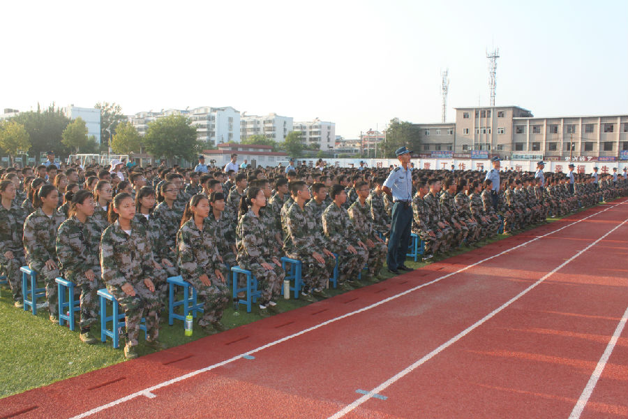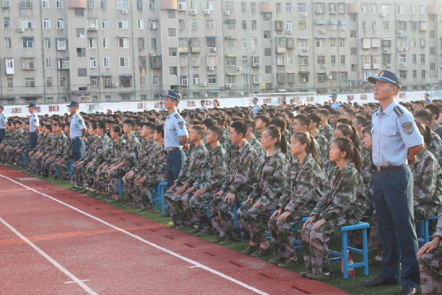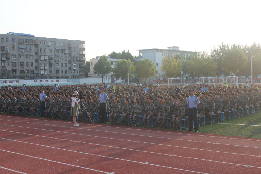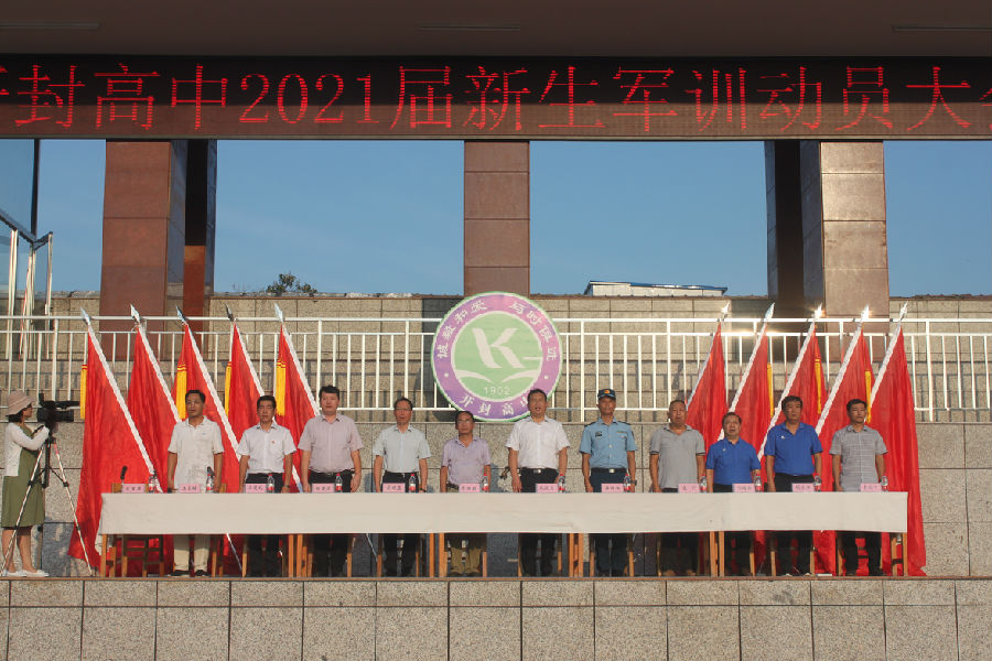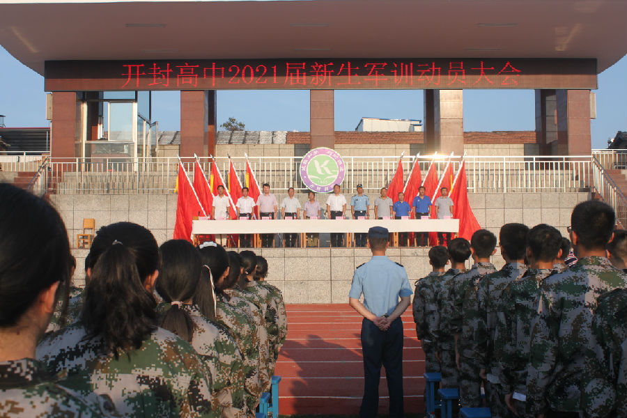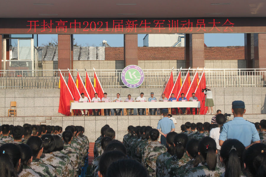 2018年8月12日下午6点,开封高中东校区2021届高一新生军训动员大会在学校操场隆重举行。本次军训任务由驻汴空军95985部队承担,全体高一学生,身着迷彩军装,齐聚操场。出席开幕式的领导有:部队首长李向阳,开高党委书记、校长耿振勇,副校长乔国颖、崔柯、马分产、刘培兵,教务主任白建涛,党办副主任李建威,总务处副主任胡宗江,高一年级主任李兆申等。大会由学生处主任王炎培主持。