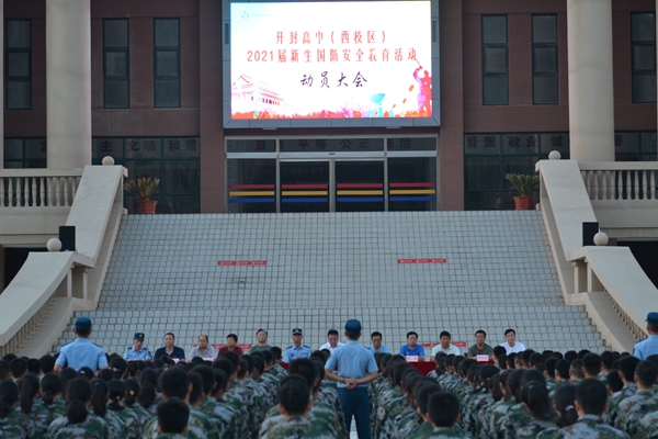 晚上6:00,开封高中(西校区)2021届新生国防安全教育动员大会在办公楼前广场举行,校领导和教师、教官及学生代表的讲话,深深的鼓舞了每一位同学,相信他们在7天的训练中定能取得优异的成绩,为即将到来的高中学习生活,打下坚实的基础。