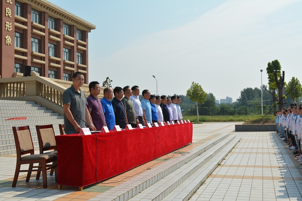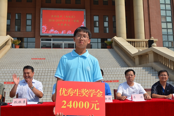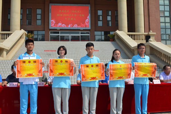 8月26日上午十点,开封高中西校区2018—2019学年第一学期开学典礼在校办公楼前举行,开封高中党委书记、校长耿振勇,党委副书记、副校长顾伯宇,副校长宋全会,校务委员王新国、李沛、荣海洋,师训处主任毛广文,总务处副主任王双虎,高三年级主任张晋波,高二年级主任高彦磊,高一年级主任张辰贝及校学生会主席李雨桐同学在主席台就坐,开学典礼由校综合办主任张志强主持。