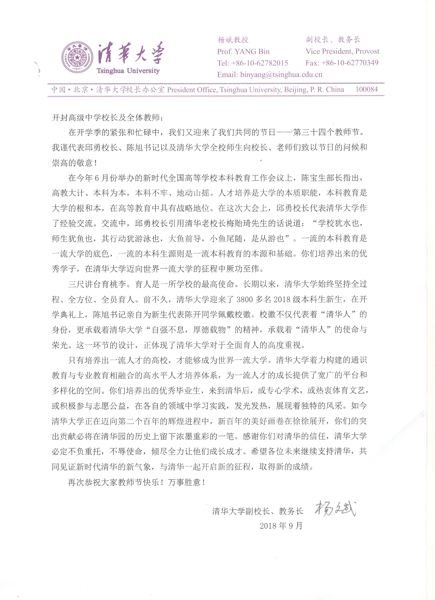 值全国第三十四个教师节来临之际,清华大学副校长、教务长杨斌给我校寄来贺信,代表清华大学校长邱勇、党委书记陈旭以及清华大学全校师生向我校全体教职工致以节日的问候。