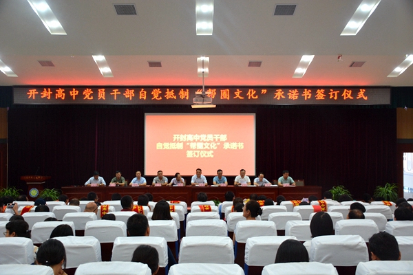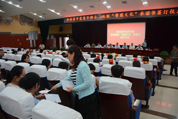 为严肃党内政治生活、严明党的政治纪律和政治规矩,净化党内政治生态,坚决整治在党内搞团团伙伙、拉帮结派等违反政治纪律和政治规矩的行为,治理党内关系庸俗化,纯洁党员干部的工作圈、生活圈、社交圈,促进形成清清爽爽的同志关系,规规矩矩的上下级关系,营造风清气正的良好政治生态。根据中央第一巡视组巡视反馈意见,按照省委、市委巡视整改工作安排部署,为使自觉抵制“帮圈文化”的活动在全体党员中入脑入心,9月7日下午,开封高中全体党员在西校区报告厅举行党员干部自觉抵制“帮圈文化”承诺书签订仪式。学校党委要求全校党员干部通过学习党章党规,统一思想认识,明确政策界限,严格纪律责任,提高自觉抵制“帮圈文化”的主动性,全体党员签署了《开封市教育系统党员干部自觉抵制“帮圈文化”承诺书》。(撰稿:王渝鑫 摄影:王渝鑫 审核:尚嘉伟 编辑:王渝鑫)