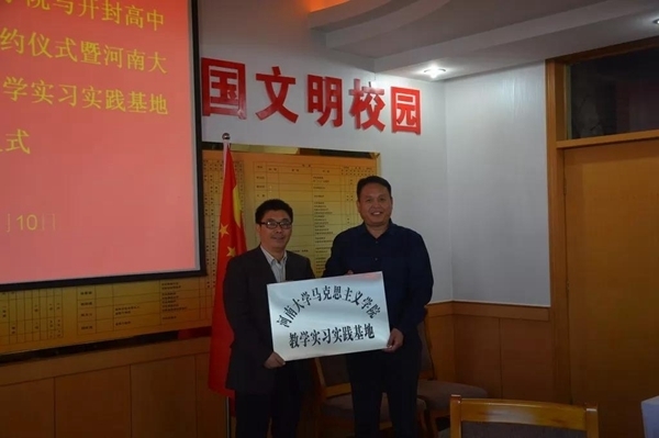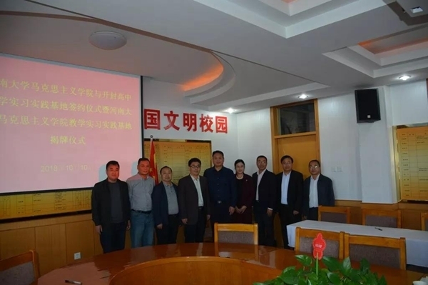 1010日上午,河南大学马克思主义学院院长张向东,副院长任东景、陈哲、彭绪琴一行在开封市人大常委、民进开封市委专职副主委、开封高中原教务主任蒋中兴陪同下莅临我校,举行“河南大学马克思主义学院与开封高中教学实习实践基地签约仪式”暨“河南大学马克思主义学院教学实习实践基地揭牌仪式”。学校党委书记、校长耿振勇,副校长乔国颖,刘培兵,校长助理、办公室主任尚嘉伟,党办副主任李建威热情接待。