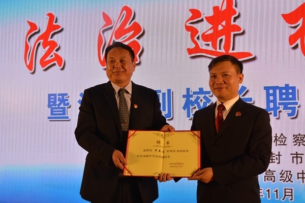 秋风送爽,金菊飘香。11月1日下午,法治进校园暨法治副校长聘任仪式在开封高中西校区报告厅举行,开封市人民检察院党组书记、检察长宋春波,河南省人民检察院副巡视员刘秋香、开封市政协副主席赵洁、开封市关心下一代工作委员会常务副主任徐福润、开封市教育局局长李尕果,团市委副书记陈嘉慧,我校党委书记、校长耿振勇,党委副书记、副校长顾伯宇,副校长宋全会等领导出席活动。