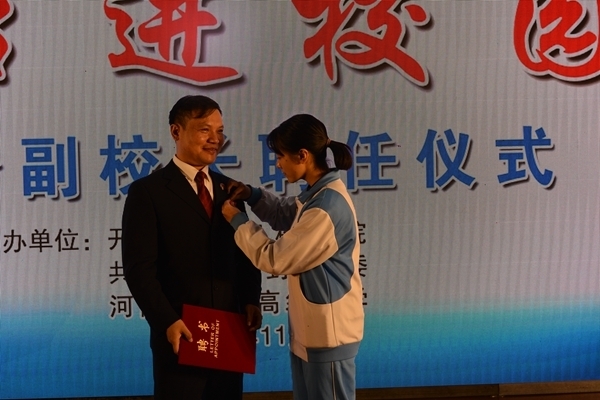 活动前,受邀领导、代表委员及在校师生参观了办公楼前的法制宣传展板,开封市教育局局长李尕果、共青团市委副书记陈嘉慧分别在会上发表了讲话, 随后开封高中校长耿振勇向市检察院党组书记、检察长宋春波颁发了法治副校长聘书,我校学生会主席赵焕然向其佩戴了校徽,宋春波检察长向学生代表赠送了法律读本,并向同学们普及了相关法律知识。