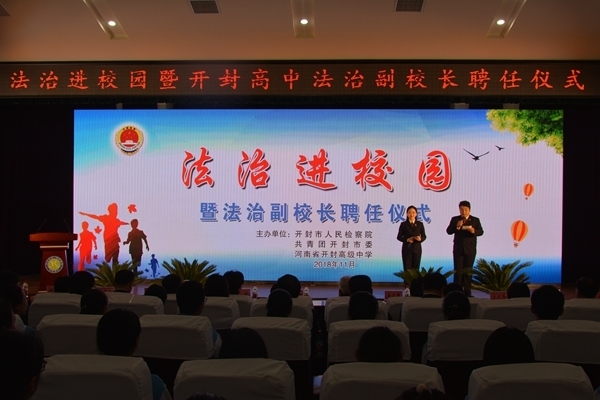 省检察院未成年人检察工作办公室副主任朱艳菊、市公安局副局长张良民、市司法局副局长张航生等领导和部分全国人大代表、政协委员、人民监督员和新闻媒体记者应邀参加。开封高中师生及家长代表450人参加了此次法治宣讲和聘任仪式。