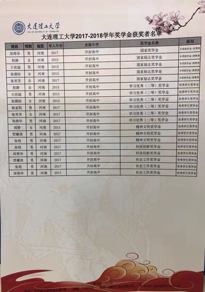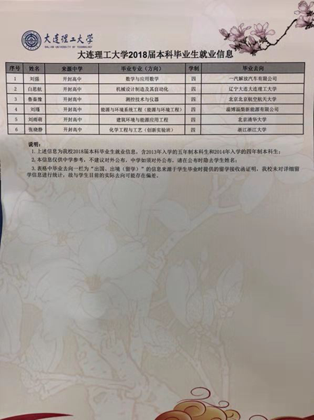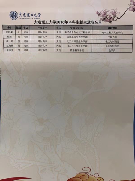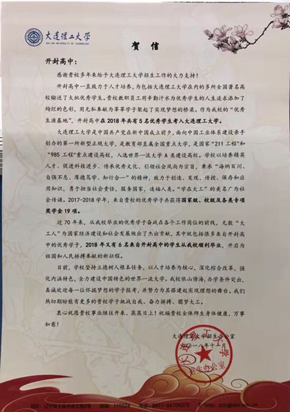 贺信中说,开封高中一直致力于人才培养,为众多全国著名高校输送了大批优秀学生,学校教职员工用辛勤汗水为优秀学生的人生追求添加了绚烂的色彩,用无私奉献为莘莘学子架起了实现梦想的桥梁。作为大连理工大学的“优秀生源基地”,2018届考入大连理工大学的优秀学生有5人。
