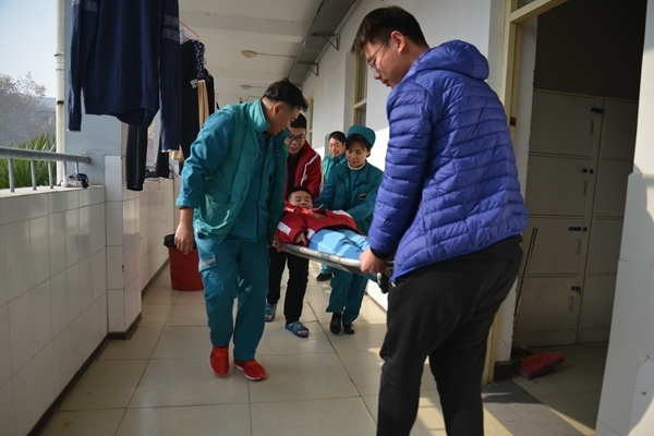 13:45演练活动正式开始,火灾警报拉响,在各寝室长的带领下,学生用湿毛巾、衣服等捂住口鼻,迅速有序按照预定逃生路线撤出宿舍,没有出现拥挤、踩踏等安全事故。120的医护人员用担架抬出行动不便的学生,对学生及时采取救治措施。全程3分50秒,住宿学生快速、有序、紧张地疏散至运动场。各楼层的管理员立即对每个房间检查有无人员滞留,寝室长负责清点各寝室人数,并汇报到现场指挥处。