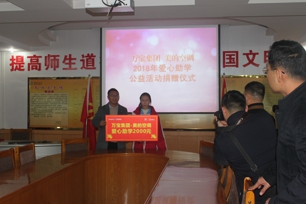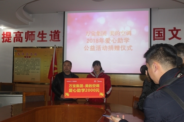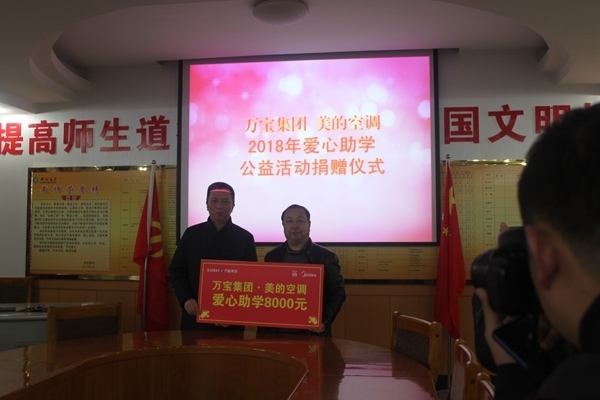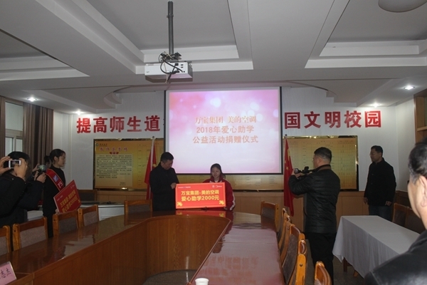 12月20日,开封市万宝集团2018年爱心捐助仪式在我校举行。万宝集团总经理杨阳、美的空调经理李文、万宝行政总监毛智杰和我校副校长刘培兵、学生处主任王炎培出席捐助活动。