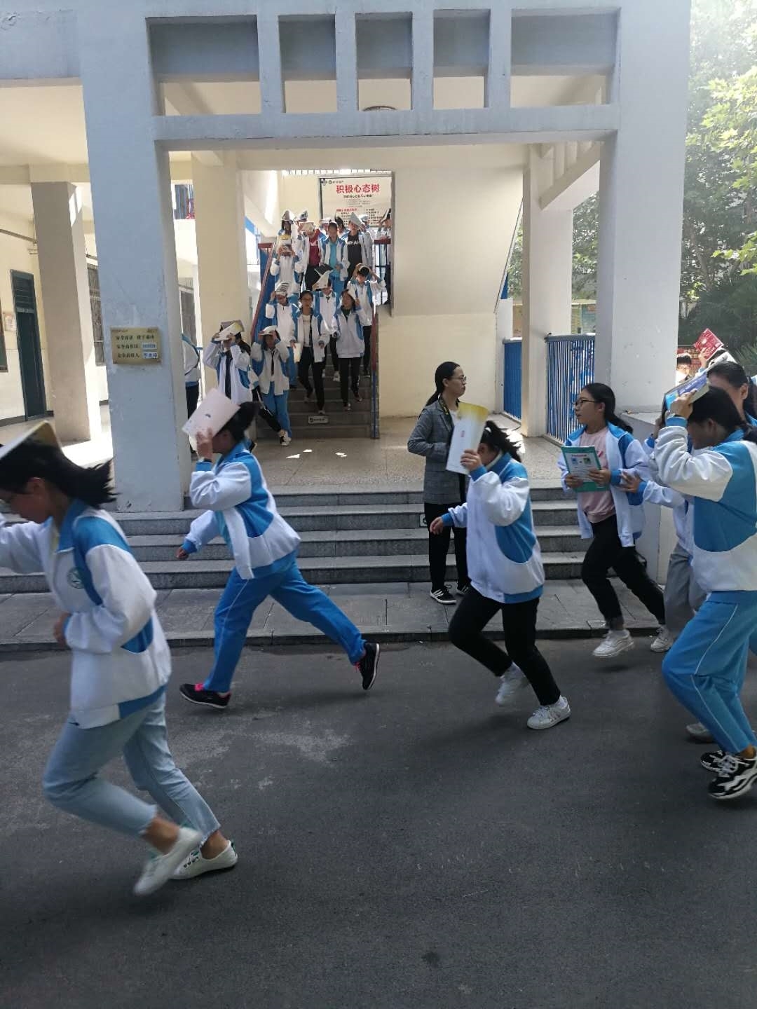 演练开始,学生处主任王炎培向全校发布疏散警报并迅速通过广播通知全校师生按规定路线紧急疏散。各班学生在老师的指挥下,有序快速地撤离到指定地点,并按照规范的动作要领做好自我防护。分布在不同地点的安全岗老师迅速到位,在教学楼各个楼层及楼梯口、操场等地及时的维持秩序,指挥学生有序撤离。整个过程按照预订方案紧张有序地开展,全体学生安全撤离后,各班清点人数上报领导小组,演练仅用时3分钟。在全校老师的有效组织和学生的认真配合下,疏散演练圆满成功。