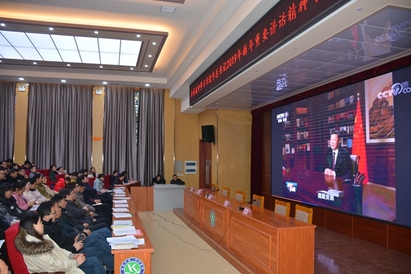 全体教职工认真观看习近平总书记2019年新年重要讲话的视频。在2019年新年贺词中,习近平总书记深情地回望过去一年极不平凡的追梦之旅,2018年是走得很充实、很坚定的一年。习主席回顾和总结了过去一年在政治、经济、民生、文化、科技、外交方面所取得的成就。并指出这些成就都是全国各族人民撸起袖子干出来的,是新时代奋斗者挥洒汗水拼出来的。习主席向每一位科学家、每一位工程师、每一位“大国工匠”、每一位建设者和参与者致敬!满怀信心寄语亿万人民勇敢踏上追寻梦想的新征程。习主席亲切的话语、殷切的期待、郑重的嘱托,激励着每一个人发扬梦想之精神,继续在奔跑中实现梦想。