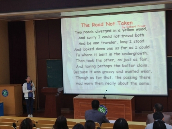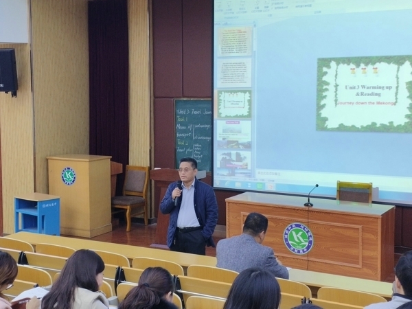 首先,英语组新进老师张嘉琦就新课程改革导学提纲的使用进行了课堂教学展示,她以必修一Unit3 Warming up为授课内容,以制作精良的课件为载体,以Robert Frost 的诗歌the Road not Taken 为切入点,将老师们带入了通向the Mekong River的绝妙之旅,课堂内容活泼生动,教学活动充实多样,成功地向大家展示了一名英语教师所具有的教学技能和学科素养。