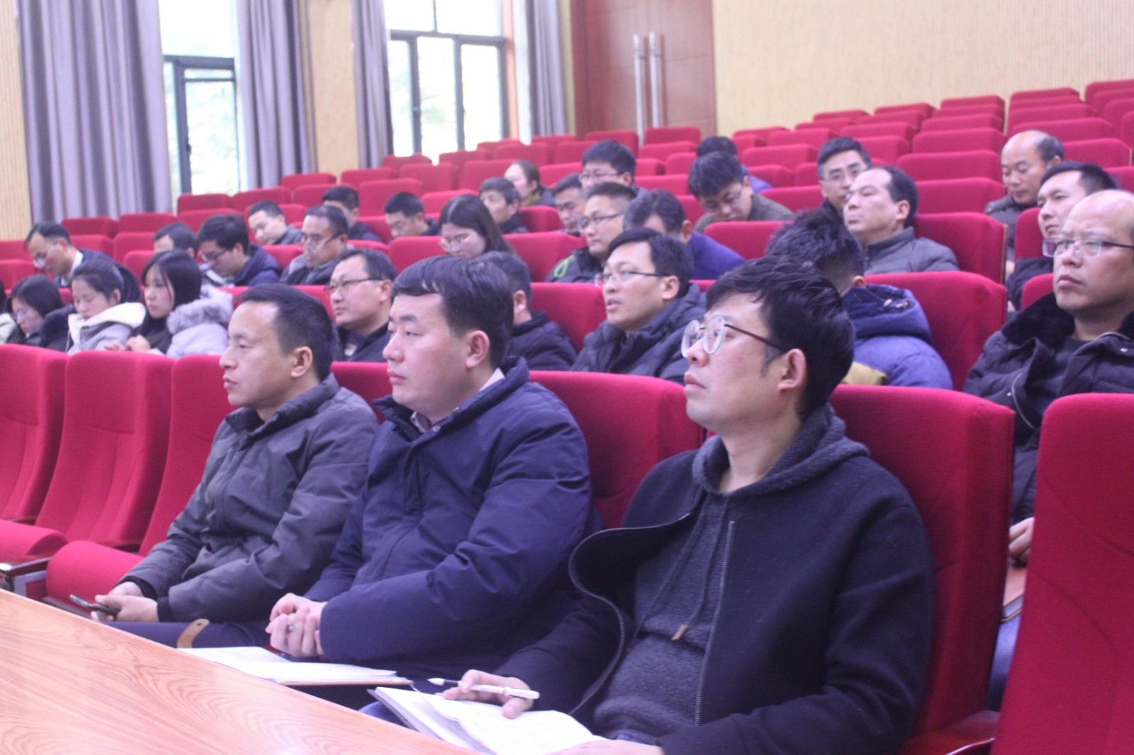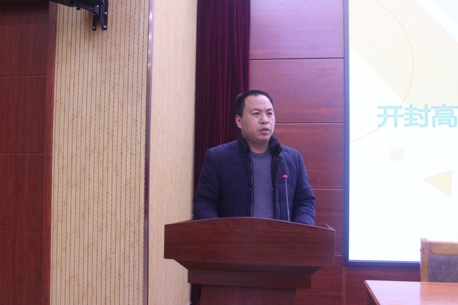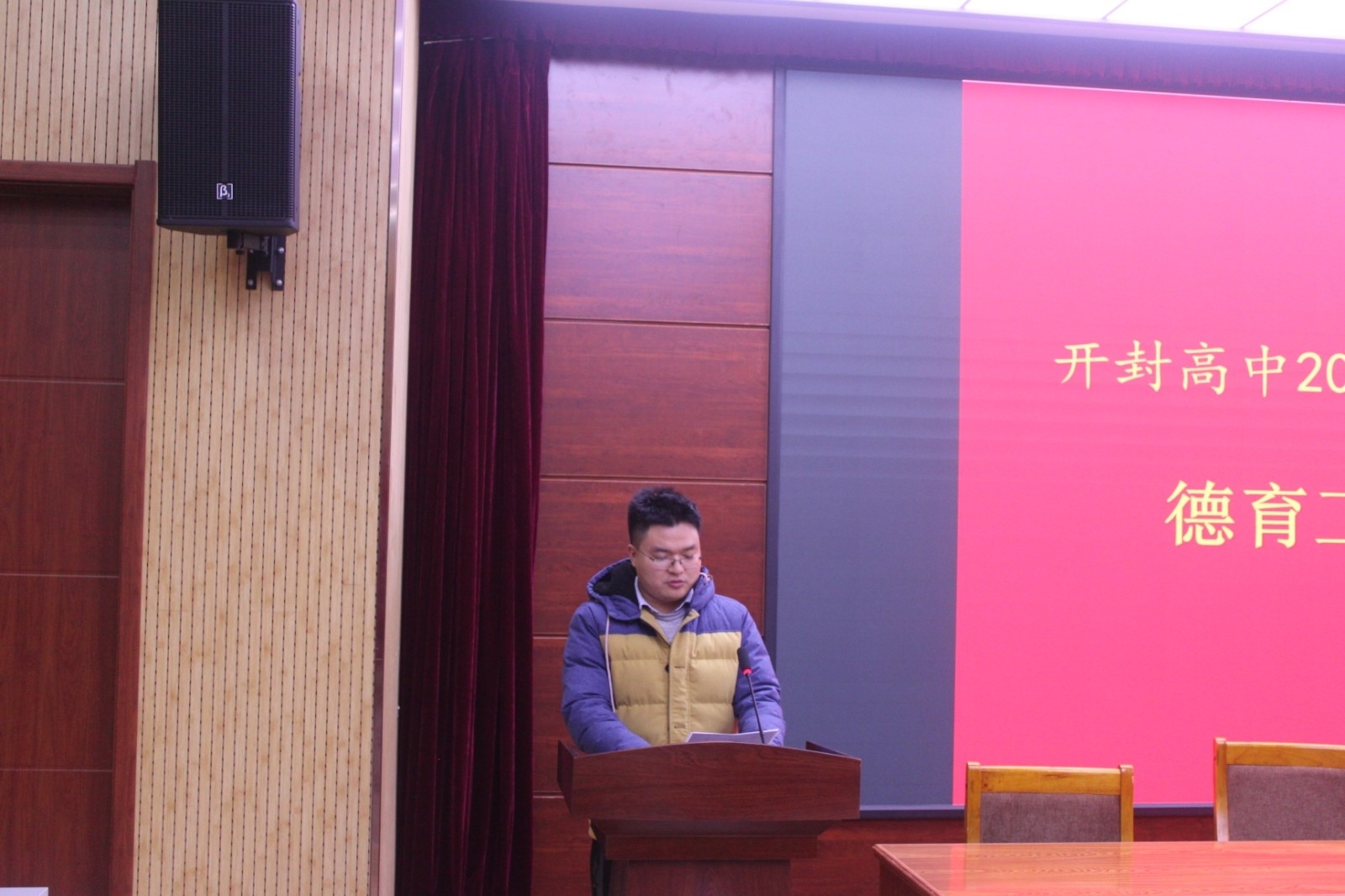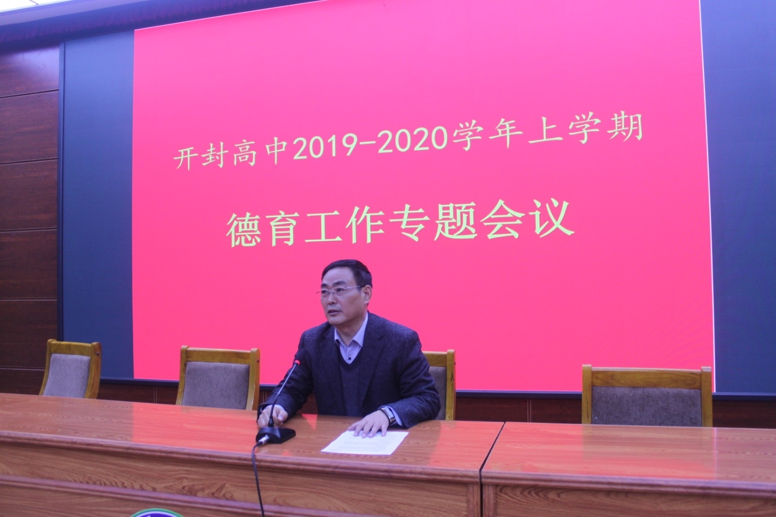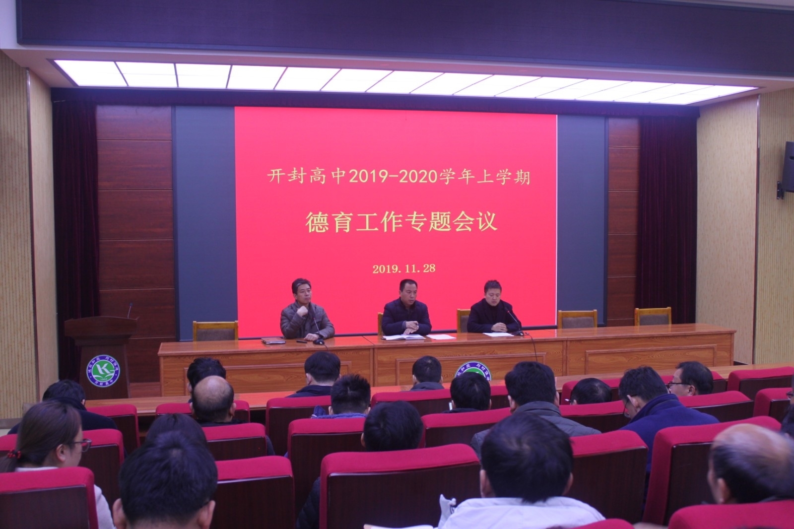 2019年11月28日下午,开封高中东校区在报告厅召开2019-2020学年上学期德育工作会议。校长顾伯宇、副校长李振华、学生处主任苗森、学生处副主任娄渊中和三个年级的全体班主任参加了会议。会议由学生处主任苗森主持。