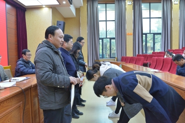 本次会议由周金陈主持。首先乔国颖宣读了上届优秀师徒表彰名单,并为他们颁发了证书;接下来苏新明宣布了本年度新的师徒结对名单,颁发聘书,行拜师礼;随后优秀师傅代表陈其龙和新徒弟代表张嘉琦上台发言,分别讲述了自己的心得和感悟,把会议推向了高潮。最后周金陈对青年教师业务能力大赛进行了动员,安排和部署,乔国颖最后做总结发言,对青年教师提出了要求和希望。