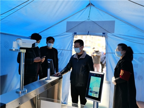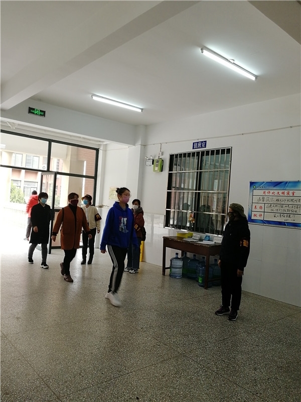 学校大门是校园疫情防控的第一道防线,“学生”根据地上的标示线排队等候进入校园,戴好口罩,经过消毒后,间隔1米排队,依次经过校门口体温检测通道。经检测体温正常后,上交健康登记表表,方可进入校园。对体温异常者,由专门人员引导至临时留观室再次进行体温检测,若体温仍异常,医护人员立即报告指挥长,告知家长,同时按照市委“五个一”复学服务机制,联系对口定点医院通过远程视频问诊系统进行规范诊疗并报上级疫情防控部门。
