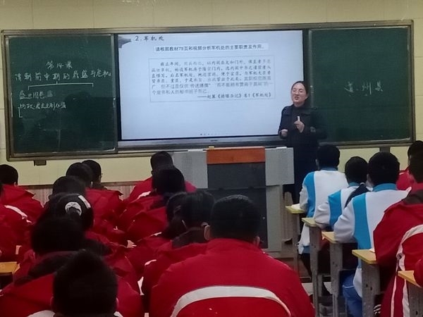 大家首先观摩了徐晴晴老师《清朝前中期的鼎盛于危机》公开课。晴晴老师用生动的语言、精美的多媒体课件、深入浅出的讲解展示了清朝君主专制的加强和祖国辽阔疆域的奠定,并将中国置于世界变化的大潮中分析了繁荣表象下潜藏的统治危机,高效完成了教学任务。晴晴老师精心设计了“历史人物模拟”、小组合作讨论等互动环节,充分调动学生学习积极性,有效落实了学生主体、教师引导的教育教学理念,实现了课堂教学由知识向素养转变的教学目标。