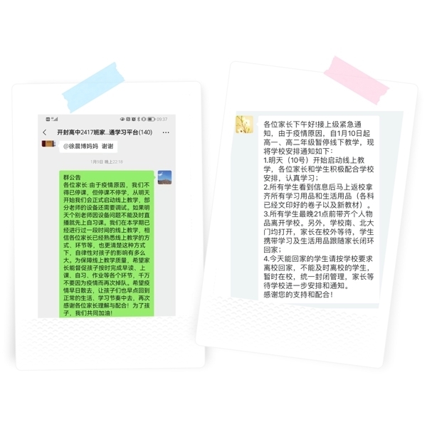班主任们在班级家长群里及时通知了我校启动线上教学的计划安排并组织学生返校拿齐所有学习用品(各科已经文印好的卷子以及新教材)和生活用品。同时,班主任们也对网络教学中可能出现的问题对家长们进行了交代以期得到家长们的理解与配合,家校合一,最大程度保障学生线上学习的效果。