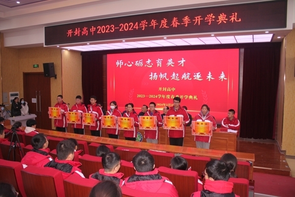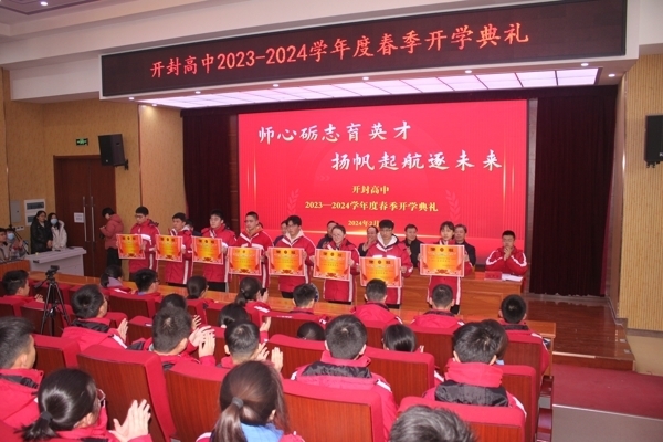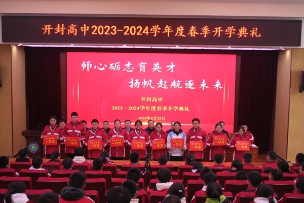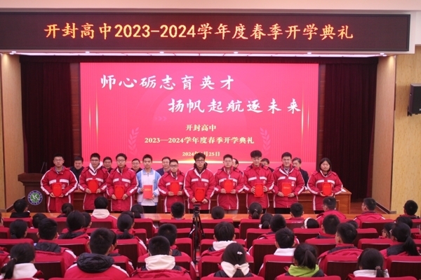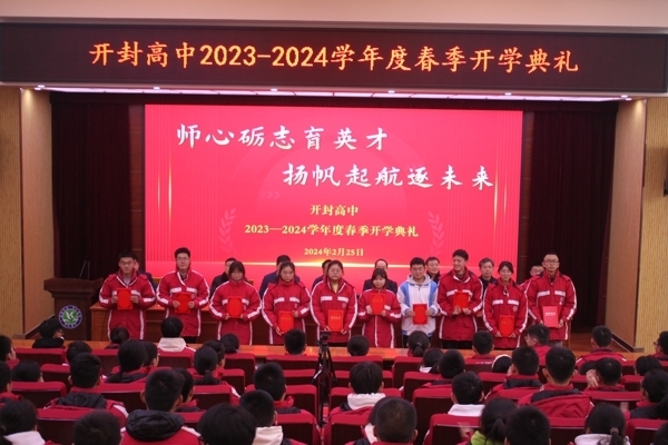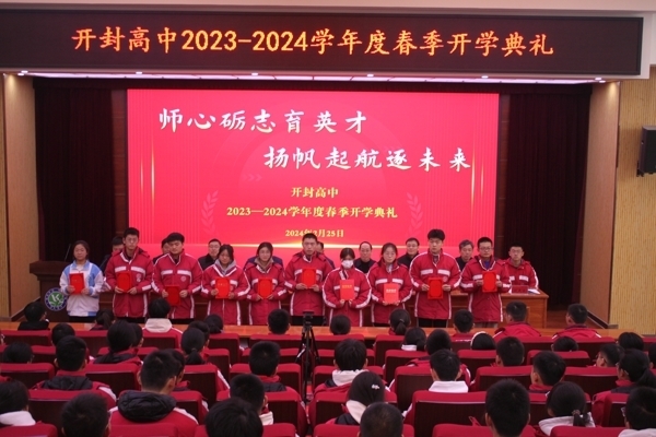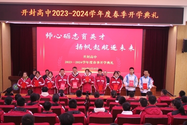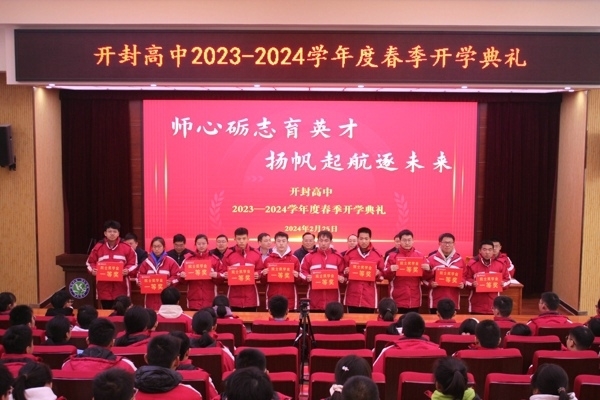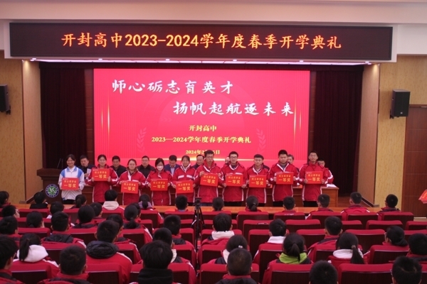 在春意盎然、万象更新的美好季节,2月25日上午9点40分,开封高中召开了2023-2024学年度春季开学典礼。典礼在东报告厅主会场和各班教室分会场进行。一百八十名学生代表于主会场参加了典礼。开封高中党委书记宋全会,校长马分产,副校长张志强,纪委书记李小记,校务委员娄渊中、荣海洋,学生会主席刘晟宇出席了主会场典礼。典礼由学生处主任苗森主持。