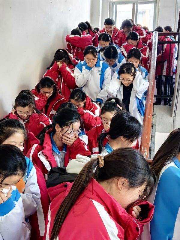 13时40分,急促的消防警报声在校园宿舍区响起,打破午休宁静,演练正式启动。听到警报后,同学们迅速响应,在生活老师和楼层引导员指挥下,用提前准备的湿毛巾、湿手帕捂住口鼻,弯腰低姿贴近墙面,沿预定路线快速有序撤离。疏散过程中,各楼层转角、楼梯口均有教职工定点值守,疏导人流并提醒学生保持安全间距,避免拥挤推搡。同学们沉着冷静、听从指挥,程序规范有序、衔接顺畅。最终全体学生安全抵达运动场指定区域,各班班长迅速清点人数并向总指挥汇报,确保无一人遗漏,从警报响起到全员集结仅用时6分10秒,展现出师生良好的应急反应与协作素养。