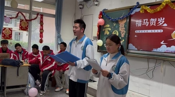 岁序更替,华章日新。2026年学生元旦联欢会于12月31日上午在各班教室举行,师生齐聚一堂,在欢声笑语中告别旧岁、喜迎新年。校务委员娄渊中致新年贺词:“新的一年、新的起点,也是新的征程。在这辞旧迎新的美好时刻,看到了同学们一年来在校园里向阳而生、逐光而行的成长足迹”。他寄语全体学生,高中三年是人生珍贵的蓄力时光,新的一年里,愿同学们心怀热爱、脚踏实地,以敬畏之心担起责任,将求学路上的风雨化作成长的养分,在磨砺中坚韧、在沉淀中成长。同时,他邀请同学们暂时卸下学业压力,尽情享受青春联欢的美好,最后祝愿全体开高学子新年快乐、学业精进,愿校园在新的一年里桃李芬芳、再谱华章。