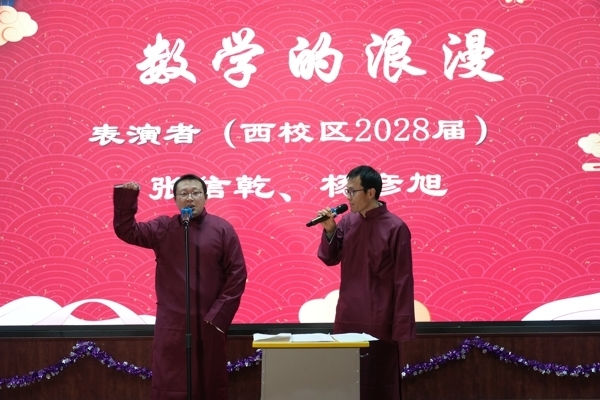 节目全部由各年级组、行政部门教职工自编自导自演。平日里学识精湛、治学严谨,舞台上的他们多才多艺、风采独特。弦歌雅乐,精彩纷呈:深情的诗歌朗诵《我爱上课》,抒发对教育事业的热爱与忠诚;活力四射的歌舞表演《学科潮秀•贺新岁》点燃了全场的热情;情景剧《老师再见》《教师“显摆”大会》,以幽默诙谐的方式再现日常教学中的温暖瞬间,笑点与泪点交织,赢得阵阵掌声;相声《数学的浪漫》、趣味配音《期末的爱与愁》,用朗朗上口的台词细数教学中的点滴,接地气的演绎让现场笑声不断;歌曲《春雨里洗过的太阳》、小品《薪火相传》里的青春风采扑面而来,传递对教育事业的赤诚热爱;歌曲《一路生花》,让大家在旋律中感受到力量与慰藉,只要心怀希望,坚持梦想,人生之路终将一路繁花似锦。每一个节目都凝聚着老师们的心血与创意,每一份欢笑都承载着对新年的期盼与祝福。穿插其中的抽奖互动环节更是惊喜不断,幸运大奖接连送出,欢声笑语、其乐融融。台上表演倾情投入,台下观众喝彩连连,报告厅内始终洋溢着欢声笑语。