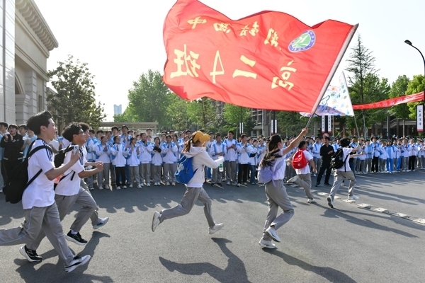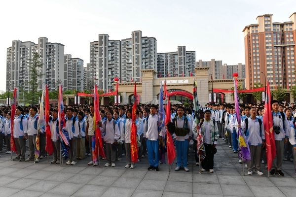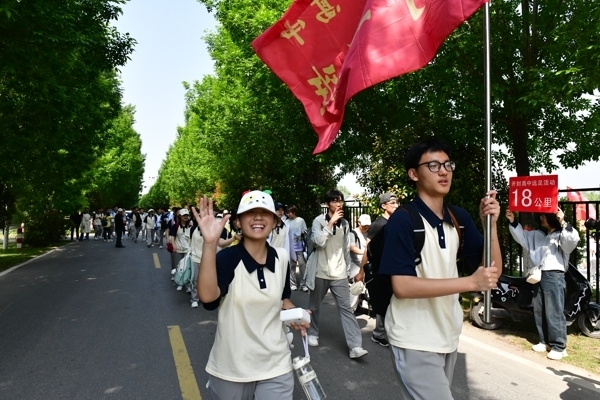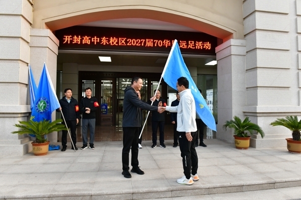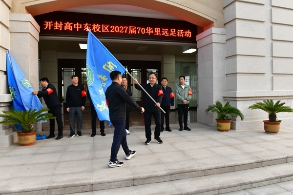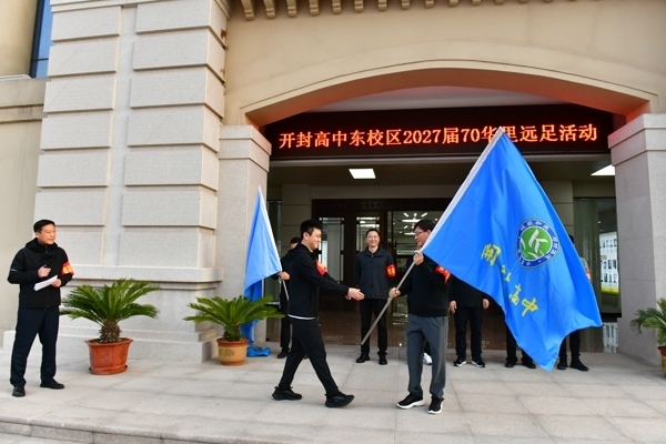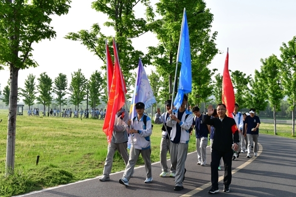 仪式上,校领导房建云、张志强、李小记、荣海洋为四个远足分团授旗。6 时 20 分,随着校长马分产的出征号令铿锵响起,全体学子精神抖擞、整装出发,向着母亲河大步迈进,拉开了长途徒步的序幕。