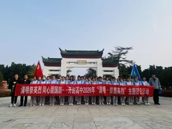 为缅怀革命先烈,传承红色基因,厚植家国情怀,2026 年3月31日7:30,开封高中师生代表69人前往开封市烈士陵园,开展“清明祭英烈 同心固国防”主题团日活动。活动在庄严的国歌声中拉开帷幕。全体师生神情肃穆,面向英雄纪念碑肃立,向为民族解放和人民幸福英勇献身的革命先烈默哀 1 分钟,表达深切的缅怀与崇高的敬意。在革命烈士纪念碑广场,学生代表稳步上前,向革命先烈敬献花篮,整理缎带,以最庄重的形式寄