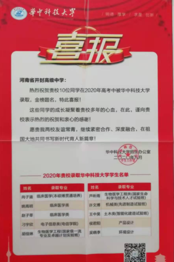 查看详情近日,我校喜报频传,华中科技大学、北京师范大学、西南石油大学纷纷为我校发来喜报。祝贺开封高中众多优秀学子金榜题名,考入理想高校。感谢我校教师的辛勤培养,并祝愿贵我两校友谊常青,继续紧密合作、深度融合,在祖国大地共同书写新时代育人新篇章!(摄影:郭玉红 审核:苏新明)