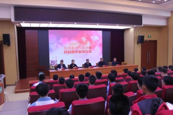 11月12日下午,“中国农业大学生源基地校奖学金”颁奖仪式在开封高中报告厅举行。为了推动我国农业现代化建设和农业科技事业发展,培养热爱“三农”事业的建设者和接班人,激励广大中学生勤奋学习,努力进取,同时加强高校与中学的联系,推动双方深化合作,中国农业大学出资在开封高中设立了“中国农业大学奖学金”。11月12日,中国农业大学植保学院马占鸿教授、植保学院教务与学生科副科长魏佳宁和植保学院团委书记张迪等