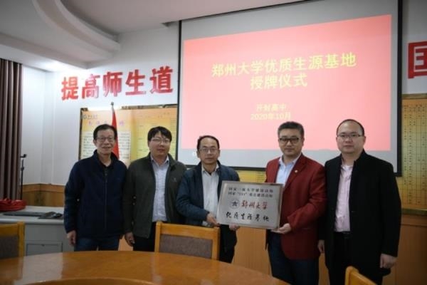 2020年10月12日下午,郑州大学招生办公室主任许立敏和郑州大学管理工程学院蔡雁岭教授莅临我校,开封高中副校长乔国颖、教务处主任周金陈和督导室主任苏新明进行了热情的接待。在学校会议室,乔校长就两位领导的到来表示热烈的欢迎。郑州大学是国家“211工程”重点建设高校、国家一流大学建设高校,也是河南省最好的高等学校,备受学生家长赞誉,今天许主任专程来到我校进行优质生源基地授牌,这是对我校成绩的认可。许