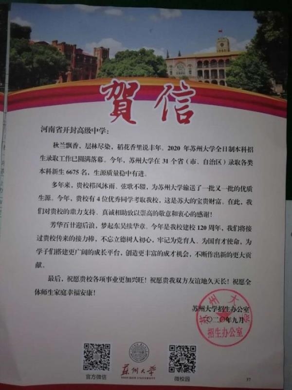 在喜迎中华人民共和国成立71周年之际,苏州大学为开封高中发来贺信。感谢我校多年来为苏州大学输送了一批又一批的优质生源,感谢我校的鼎力支持、真诚相助!并祝愿开封高中各项事业更加兴旺!祝愿贵我双方友谊地久天长!祝愿全体师生家庭幸福安康!(摄影:郭玉红 审核:苏新明)